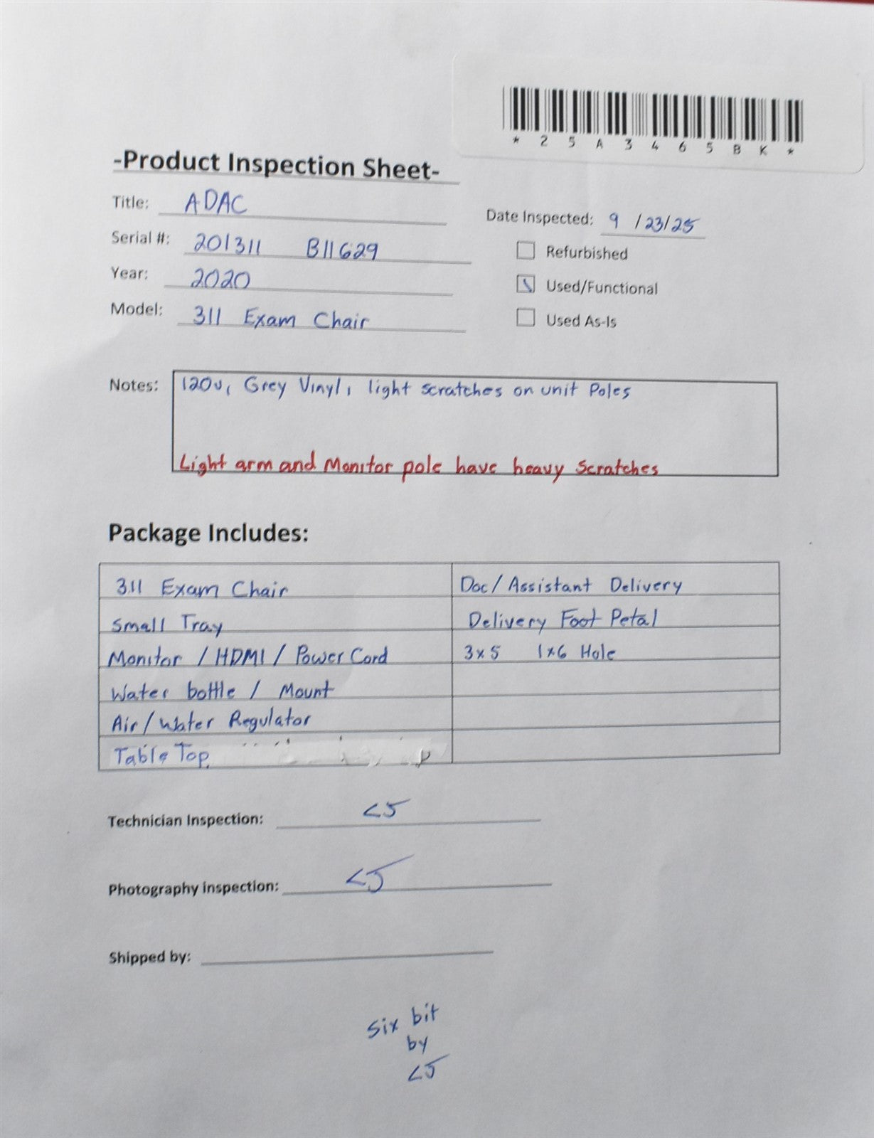 311 Exam Chair,Small Tray, Water Bottle / Water Bottle Mount, 375 Light and Mounting post, Monitor, Mounting post, HDMI and Power Cord, Pole Mount Doctor / Assistant Delivery, Foot petal, Air/Water Regulator, Table Top, 3x5 Hole, 1x6 Hole
