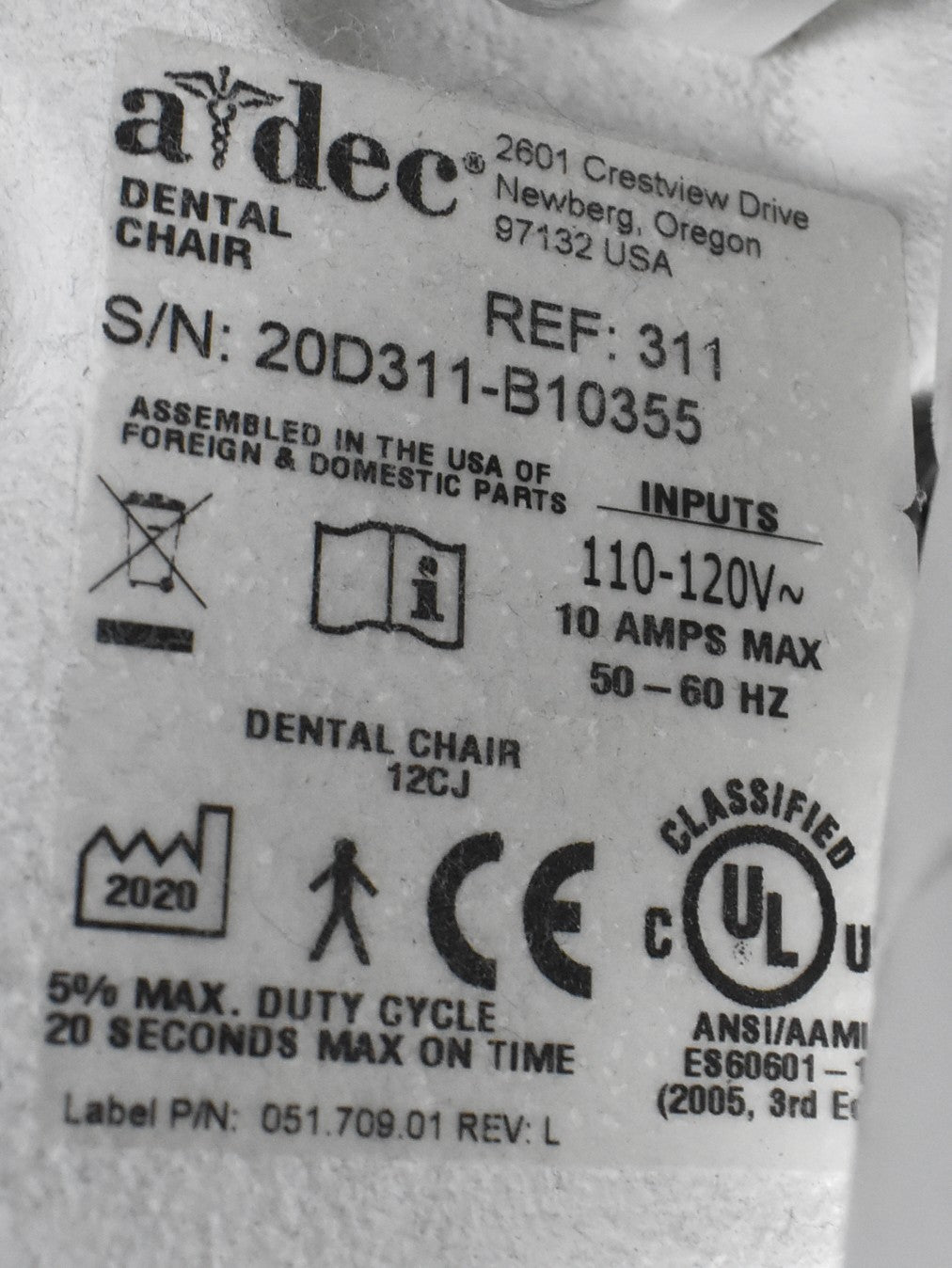 Your purchase will NOT include: Air Regulator for Cabinet mounted Assistant is missing.This product is pre-owned and may not include the same accessories as a new, unused unit. - other accessories not shown or listed here.- Checked over unit for major damage, Found only minor scratched to paint. Powered on unit into 120volt outlet, Function tested, up, down, front, and back, cleaned unit The A-dec 311 Dental chair was inspected for structural integrity, functionality, and upholstery condition. The frame is sturdy with no visible cracks or damage. The chair's hydraulic system operates smoothly, adjusting positions without delays or unusual noise. Upholstery is intact, free of tears or excessive wear. Armrests, footrest, and are secure and adjustable. All electronic controls, including the preset positions and safety switches, function properly. The unit has been cleaned and disinfected. Inspection Result: - Ready for Resale.