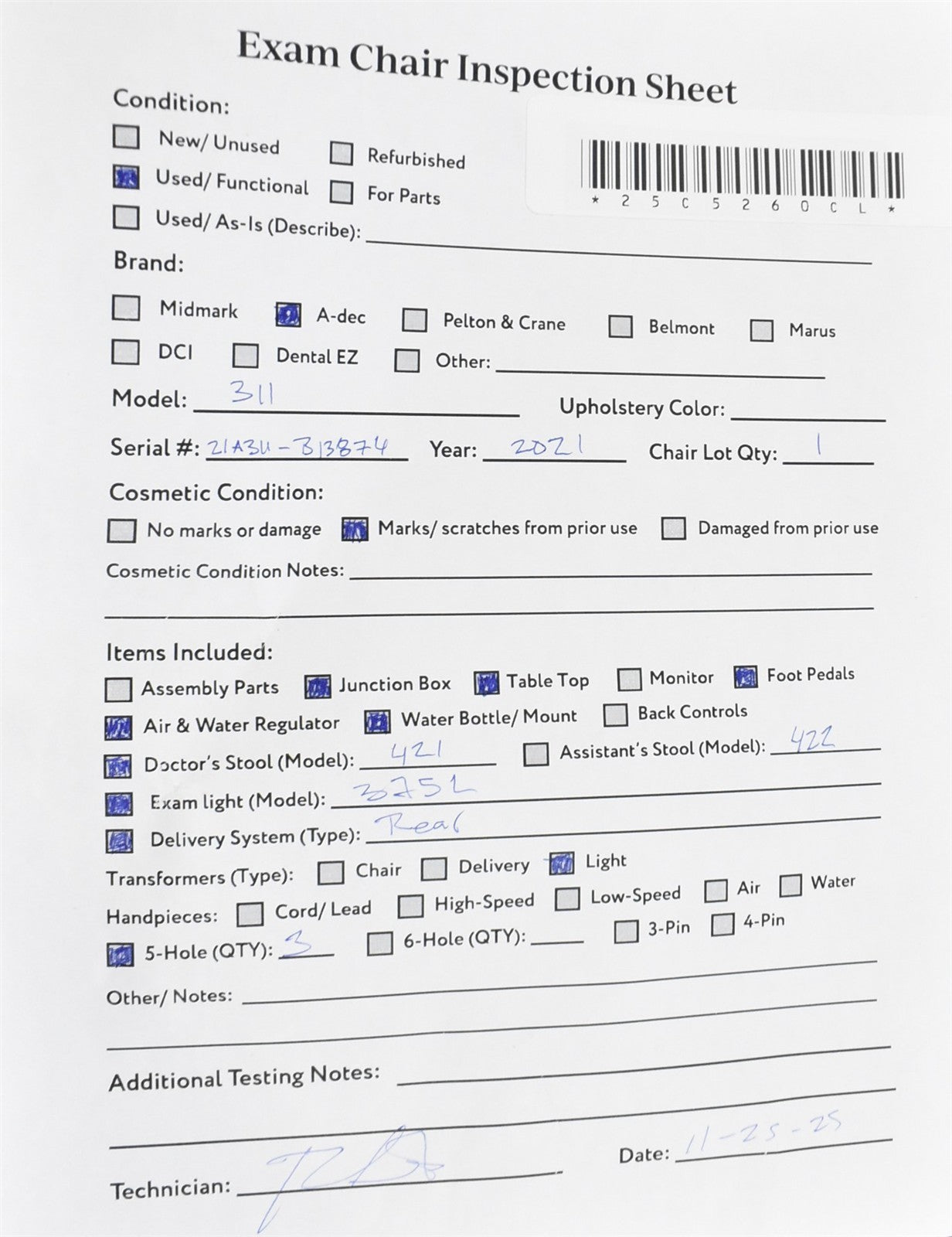 - Exam Chair Model: 311 (Gray) with 541 12 O'Clock Rear Delivery, 375L Exam Light