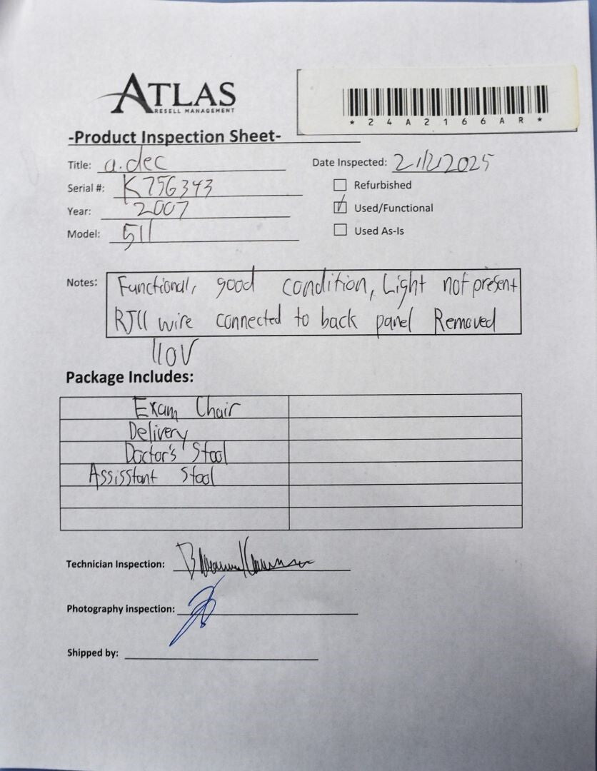 The A-dec 511 Chair, along with both of the stools were inspected for structural integrity, functionality and upholstry condition. The frame is in good condition without any cracks or structural damage. The chair's hydraulic system functions when being controlled by the delivery control unit, without any unusual noises and the only delay being when it is brought down; I had to press the button several times and when it did go down it was slightly slower. The hydraulics didn't function when controlled by the back panel due to the faulty RJ11 wire connecting it to the chair. Therefore, it was removed and will need to be replaced in order to use the back panel. The upholstry is in overall good condition with a few light stains and two small cracks on the edges of the chair. There is no light with the unit so that will have to be added as well. Inspection Result: Passed - Ready for Resale, but an RJ11 cable and light will have to be installed.