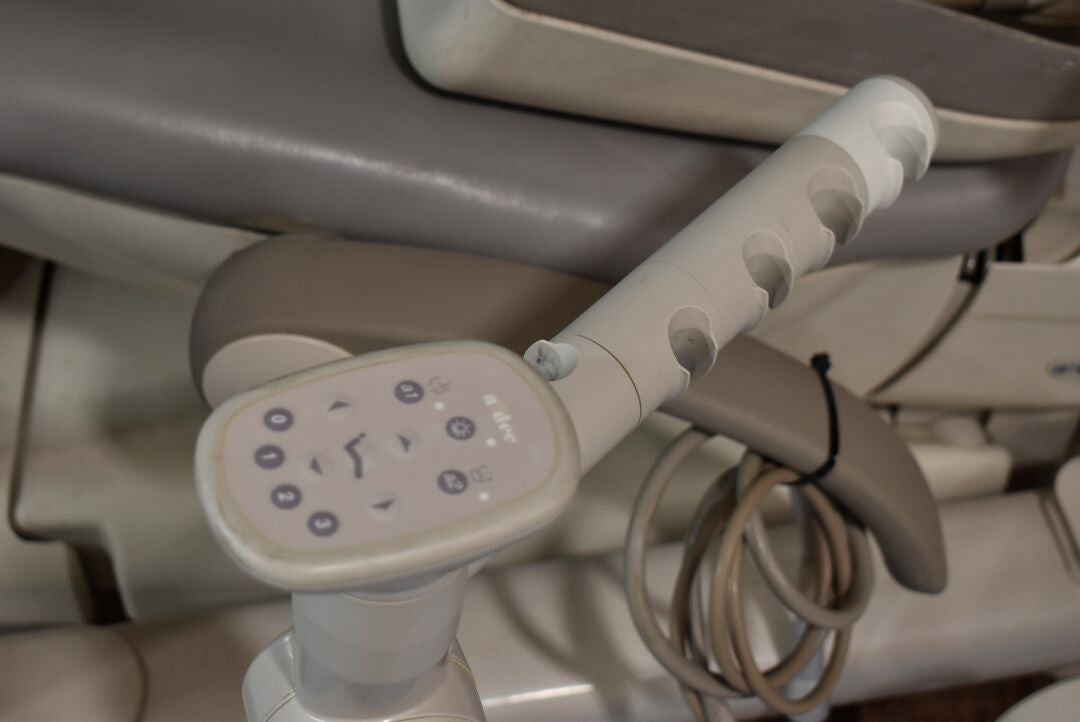 I plugged the power cord of this chair to a 120V power source and manually turned it on. Then I used both the back and front control panels to test the chair lift, its front and back leaning, and the light. At first, it could raise itself, lean back, and turn the light on, but wouldn't go back down or lean forward. Then I added an Adec foot pedal which could control the chair without issue, meaning it was the RJ11 cords connected to the panels that were non-functional, so I removed both of them. Once new cables are added this unit will be fully functional. The cosmetic condition is good, but there is some stains, rust and gunk buildup that I couldn't remove on some of the surface of the unit and the cords. Both stools are in good condition with some marks on their upholstry and frame. -BH