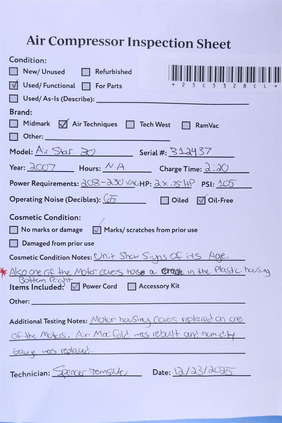 The unit was powered on and allowed to run continuously until it automatically shut off via the pressure switch at 105 PSI, confirming proper pressure regulation. During the fill cycle, operating sound levels were measured and recorded at 65 decibels, indicating normal noise performance. Compressed air was then discharged while the unit remained powered to verify pressure recovery, and the motors successfully re-engaged at 84 PSI, confirming correct cut-in operation. Following testing, the unit was thoroughly cleaned from top to bottom, and all motor air intake filters were inspected and found to be in acceptable condition. Also, the air manifold was rebuilt and a plastic motor cover was replaced.