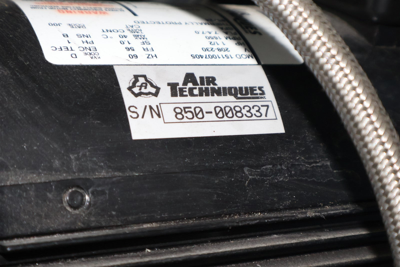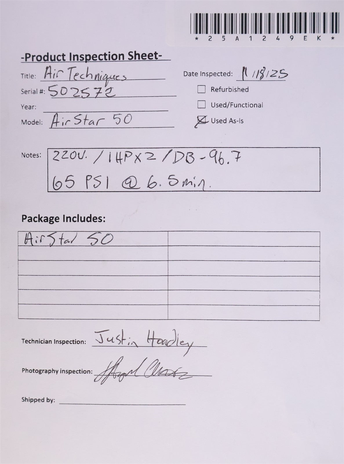 The unit was powered on and evaluated for both pressure output and potential air leaks. During testing, the dual motors operated continuously for approximately 6.5 minutes, yet system pressure plateaued at only 65 PSI. This performance suggests that one of the compressor heads may be failing or operating below specification. Due to this condition, the unit is being offered strictly for parts and is sold as‑is.
