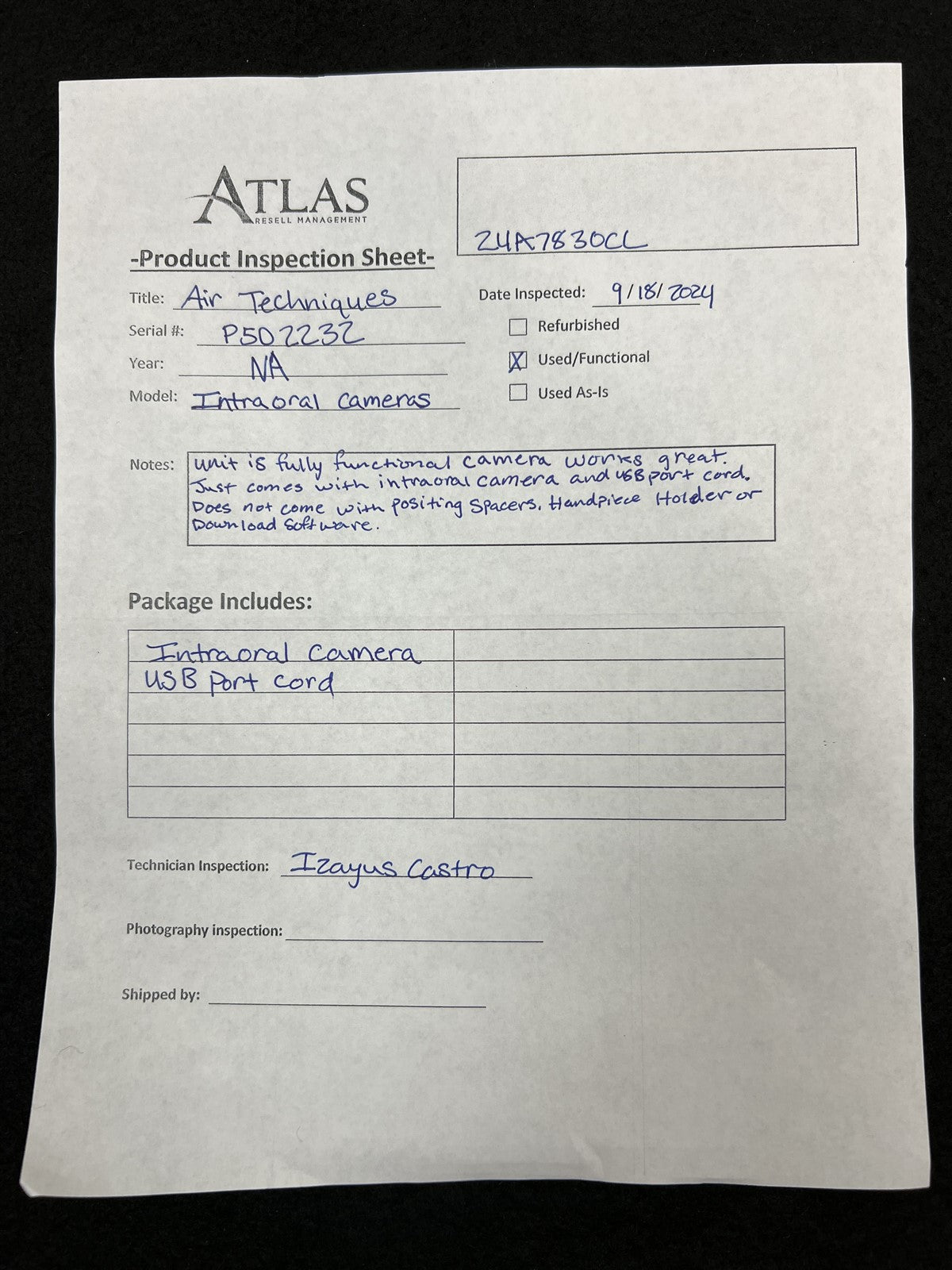 Unit is fully functional camera works great. Just comes with intraoral camera and USB port cord. Does not come with positioning spacers, handpiece holder, or download software.