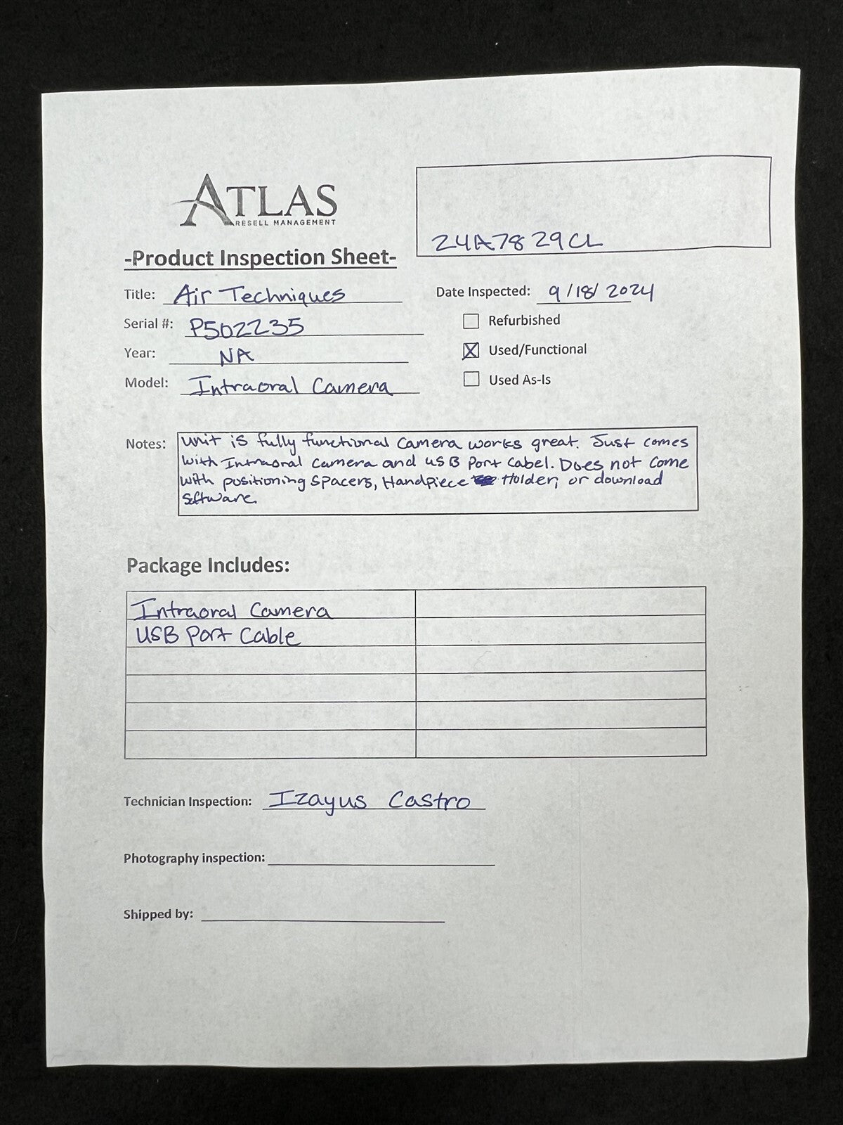 Unit is fully functional camera works great. Just comes with intraoral camera and USB port cord. Does not come with positioning spacers, handpiece holder, or download software.