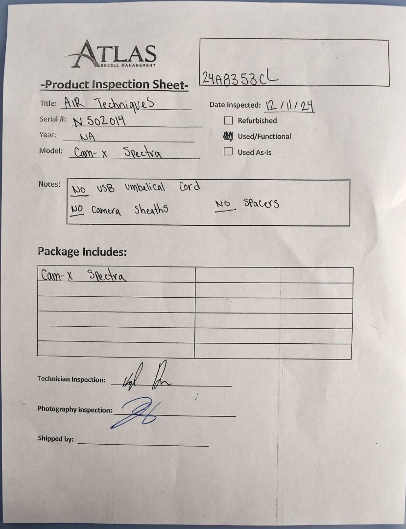 Your purchase will NOT include: does NOT include USB umbilical, any camera sheaths or spacers. SoftwareThis product is pre-owned and may not include the same accessories as a new, unused unit. - other accessories not shown or listed here.Visually inspected unit for any damage or missing parts. This Air Techniques Cam-X Spectra does NOT include USB umbilical, any camera sheaths or spacers. ONLY INCLUDES CAM-X Spectra. Good overall condition. Camera is free of any scratches or cracks.