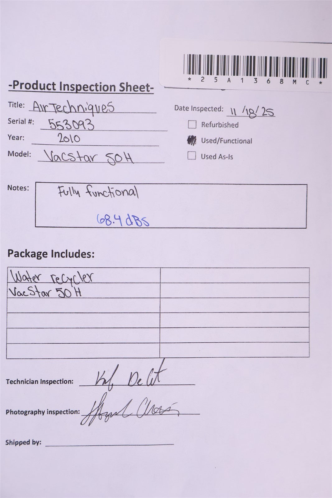 Your purchase will NOT include: This product is pre-owned and may not include the same accessories as a new, unused unit. - other accessories not shown or listed here.Prior to function testing this Air Techniques VacStar 50H, it was visually inspected for any damage or missing components that would interfere with units complete functionality. Unit is complete and free of significant damage. Including water recycler as well and tubing to switch from direct outlet to water recycler. Proceeded to hardwire unit to required power source, and powered each motor head on individually to ensure function. Both sound smooth and free of obstruction, reading at 68.4 dBs. Suction is adequate. FINAL INSPECTION STATUS= PASSED. FULLY FUNCTIONAL
