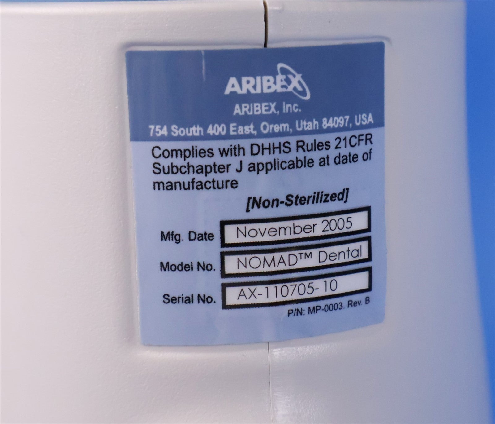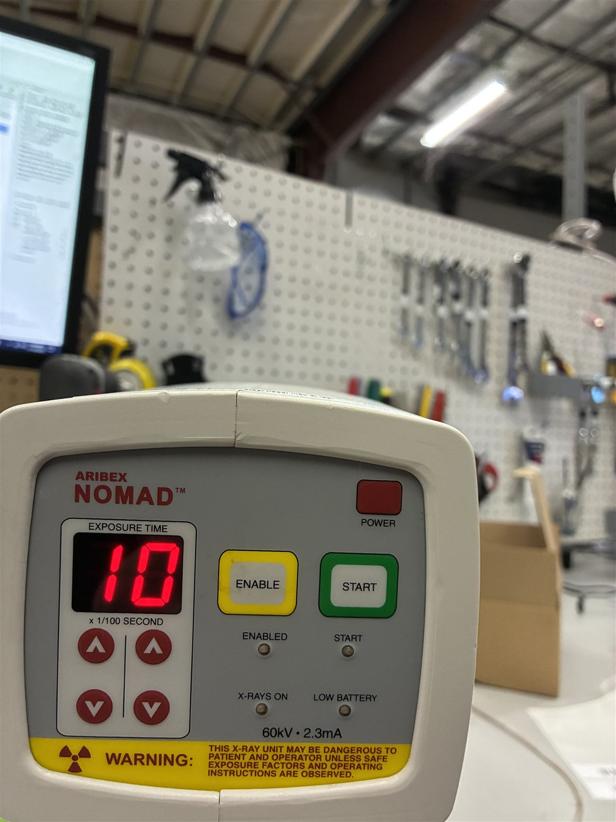 Your purchase will NOT include: This product is pre-owned and may not include the same accessories as a new, unused unit. - other accessories not shown or listed here.Prior to function testing this Aribex Nomad, it was visually inspected for any damage or missing components that could impair units complete functionality. Backscatter has damage where x-ray head inserts. Unit required charging base! Charged both battery packs, attached battery pack to Aribex Nomad Dental handheld x-ray, powered unit on. Which successfully did, with no error codes presented. Adjusted exposure settings, digital display presented clear exposure setting. Enabled fire, and fired unit with head facing an imaging plate to obtain functionality. A green circle was illuminated, indicating head is firing upon trigger. Fired unit on multiple exposure settings. FINAL INSPECTION STATUS= PASSED. FULLY FUNCTIONAL AND COMPLETE.