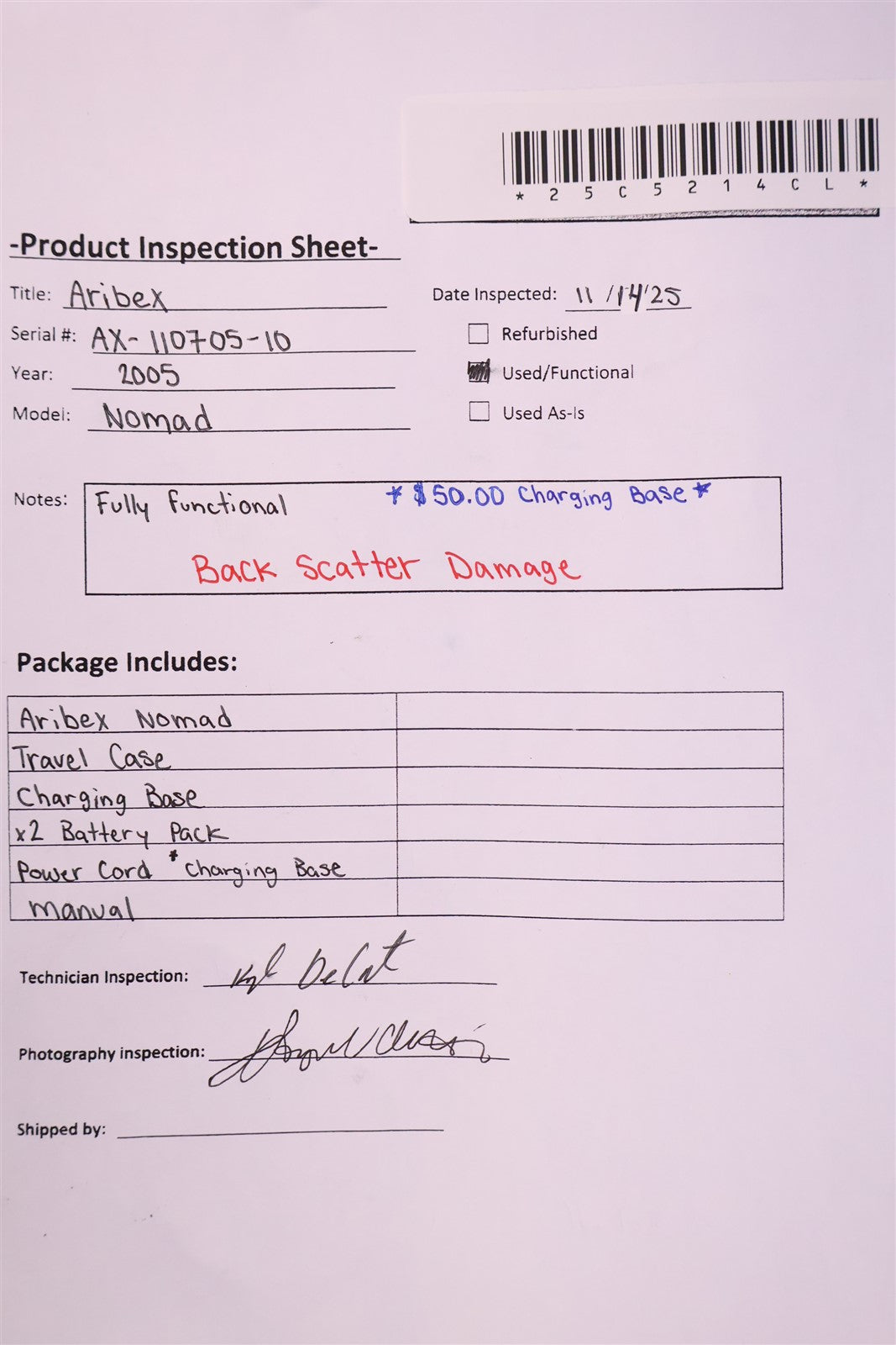 Prior to function testing this Aribex Nomad, it was visually inspected for any damage or missing components that could impair units complete functionality. Backscatter has damage where x-ray head inserts. Unit required charging base! Charged both battery packs, attached battery pack to Aribex Nomad Dental handheld x-ray, powered unit on. Which successfully did, with no error codes presented. Adjusted exposure settings, digital display presented clear exposure setting. Enabled fire, and fired unit with head facing an imaging plate to obtain functionality. A green circle was illuminated, indicating head is firing upon trigger. Fired unit on multiple exposure settings. FINAL INSPECTION STATUS= PASSED. FULLY FUNCTIONAL AND COMPLETE.