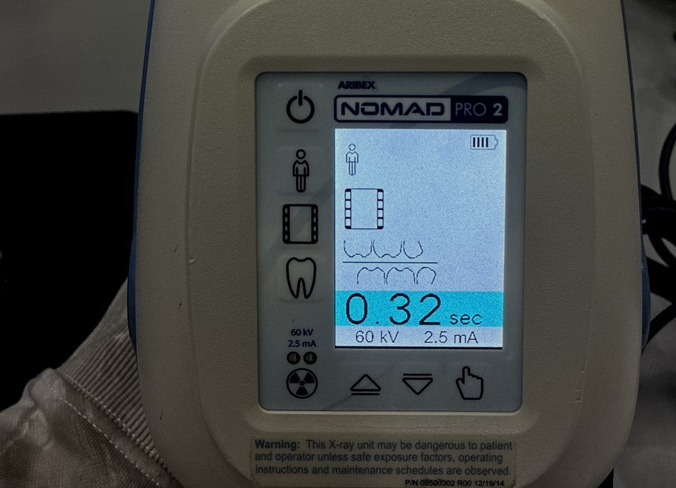 The ARIBEX NOMAD Pro 2 is a handheld, battery-powered intraoral X-ray system designed to provide high-quality diagnostic imaging with maximum mobility. Its primary function is to capture radiographs chairside, allowing the operator to stay in the room with the patient, which improves workflow and patient comfort. Weighing approximately 6 lbs, Captures sharp, diagnostic-quality images using a 0.4 mm focal spot and a 60kV DC generator and works seamlessly with digital sensors, phosphor plates (PSP), and traditional dental film. This unit under went a functionality inspection. Including visual and functionality. Included with this Aribex Nomad PRO 2 is an Aribex WHITE Nomad Pro 2 Handset, Aribex WHITE charging craddle, and the tube assy with a damage free backscatter shield. Attached battery to tube assy, powered unit on. Digital display presented a clear interface. All keypad functions respond when engaged. Fired at an imaging plate, where a green circle illuminated indicating a response between trigger and firing. No damage cosmetically. FINAL PRODUCT QUALITY INSPECTION STATUS- PASSED.