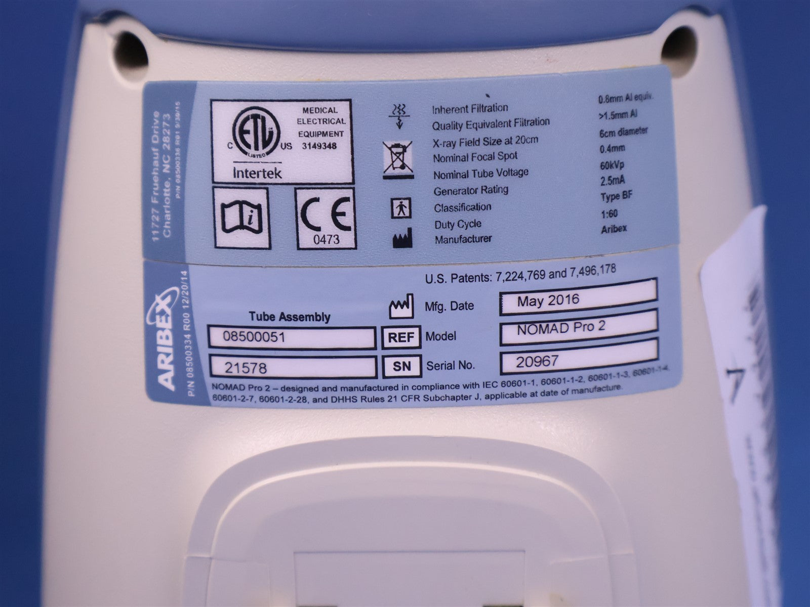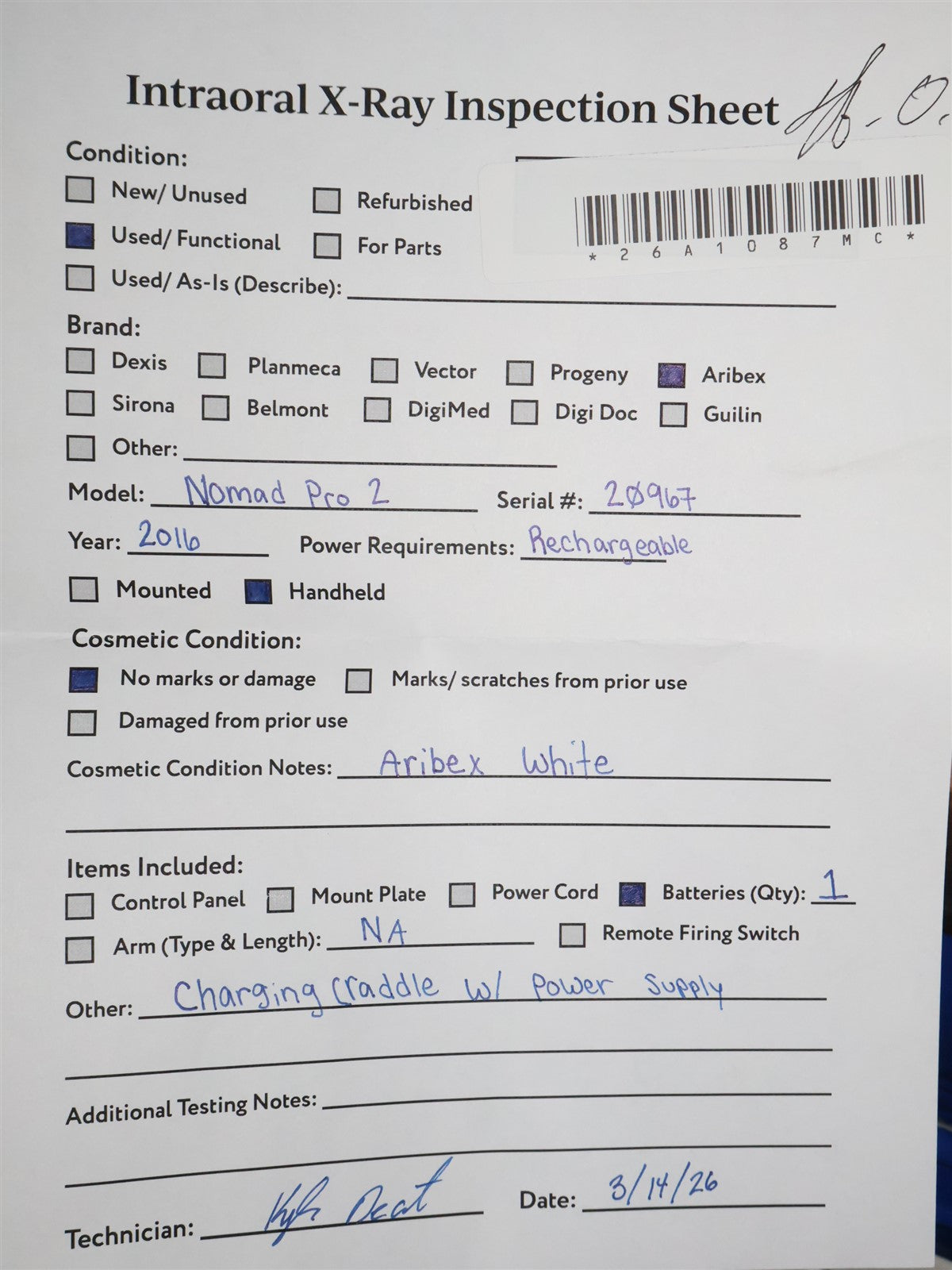 Your purchase will NOT include:This product is pre-owned and may not include the same accessories as a new, unused unit. - other accessories not shown or listed here.The ARIBEX NOMAD Pro 2 is a handheld, battery-powered intraoral X-ray system designed to provide high-quality diagnostic imaging with maximum mobility. Its primary function is to capture radiographs chairside, allowing the operator to stay in the room with the patient, which improves workflow and patient comfort. Weighing approximately 6 lbs, Captures sharp, diagnostic-quality images using a 0.4 mm focal spot and a 60kV DC generator and works seamlessly with digital sensors, phosphor plates (PSP), and traditional dental film. This unit under went a functionality inspection. Including visual and functionality. Included with this Aribex Nomad PRO 2 is an Aribex WHITE Nomad Pro 2 Handset, Aribex WHITE charging craddle, and the tube assy with a damage free backscatter shield. Attached battery to tube assy, powered unit on. Digital display presented a clear interface. All keypad functions respond when engaged. Fired at an imaging plate, where a green circle illuminated indicating a response between trigger and firing. No damage cosmetically. FINAL PRODUCT QUALITY INSPECTION STATUS- PASSED.