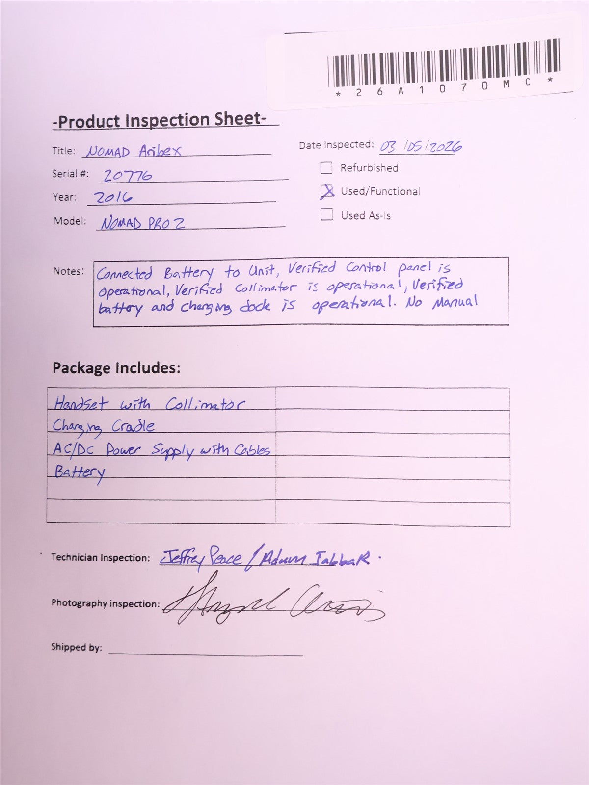 Your purchase will NOT include:ManualThis product is pre-owned and may not include the same accessories as a new, unused unit. - other accessories not shown or listed here.Connected battery to unit, verified control panel is operational, verified collimator is operational, verified battery and charging dock are operational.