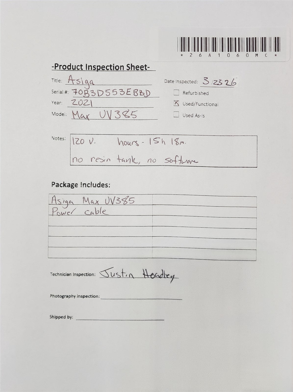 Your purchase will NOT include:Manual, Tray, External Software, Curing UnitThis product is pre-owned and may not include the same accessories as a new, unused unit. - other accessories not shown or listed here.Plugged in Unit, Powered On Unit. Control Panel Functions, Internal 3D Elevator Functions.