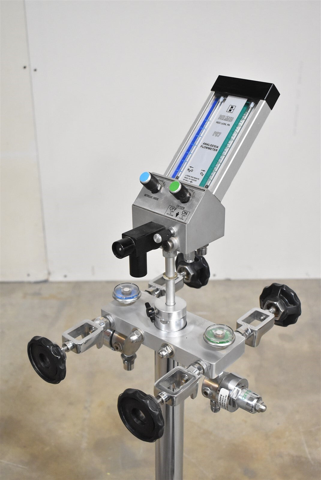 Refurbished unit, tested with nitrogen and oxygen tanks, regulators function properly. All dials and meters functioning properly as well. Package comes with the flowmeter, and 4 tank wheeled cart. DOES NOT come with the circle seals or the blue and green hose.