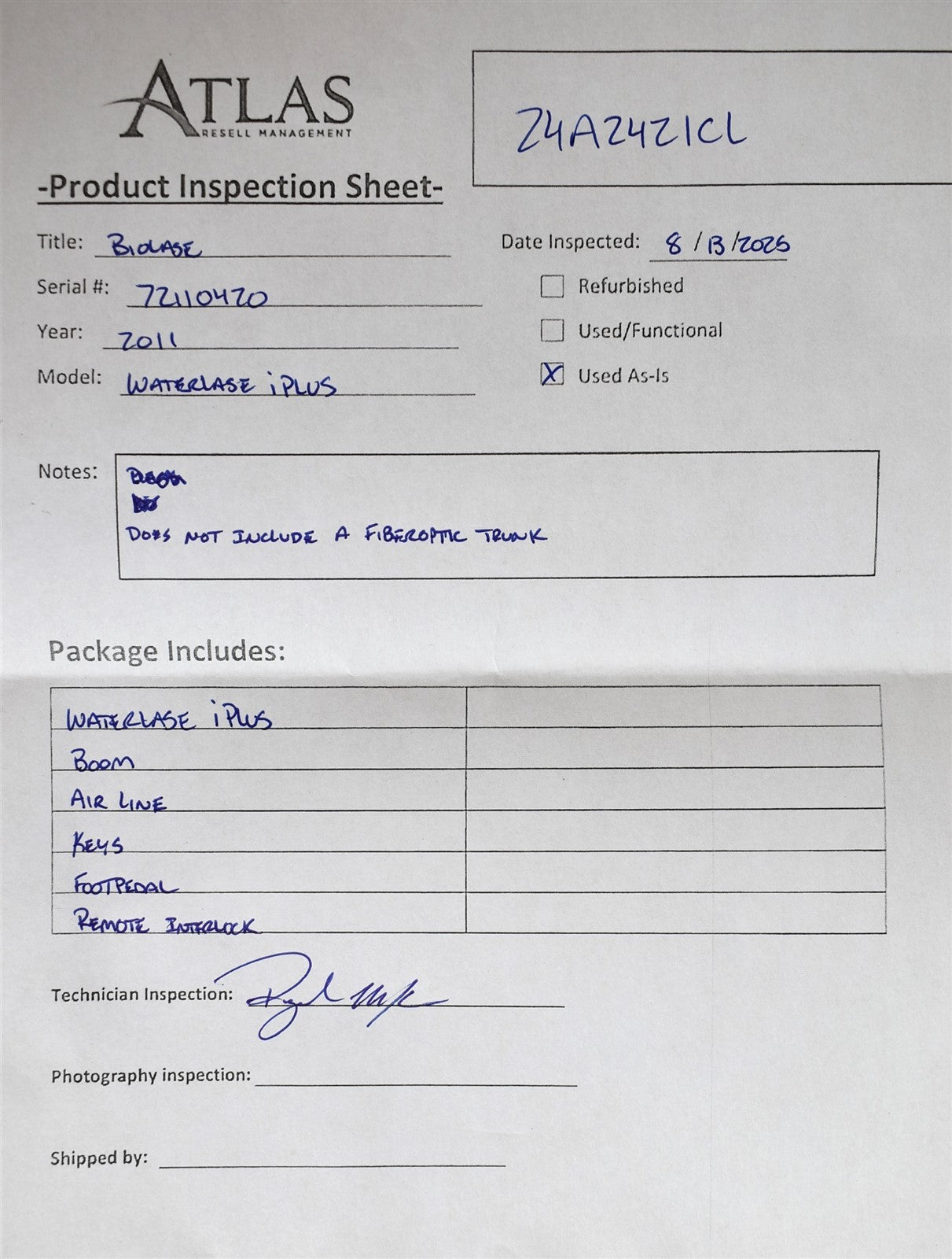 Your purchase will NOT include: FiberOptic Trunk - other accessories not shown or listed here.Biolase Waterlase iPlus – Dental Laser SystemKey FeaturesAdvanced laser technology for precise soft and hard tissue procedures.Minimally invasive treatment for patient comfort and faster healing.User-friendly interface with customizable settings for various procedures.Durable design for reliable daily use in dental practices.Biolase Waterlase iPlus – Efficient, precise, and versatile laser dentistry.Visually inspected the unit for any damaged or missing parts and accessories. This unit does not come with a fiberoptic trunk. Borrowed a fiber trunk from another unit. Function tested the unit and found it to be functional. This unit is incomplete without the fiber trunk.
