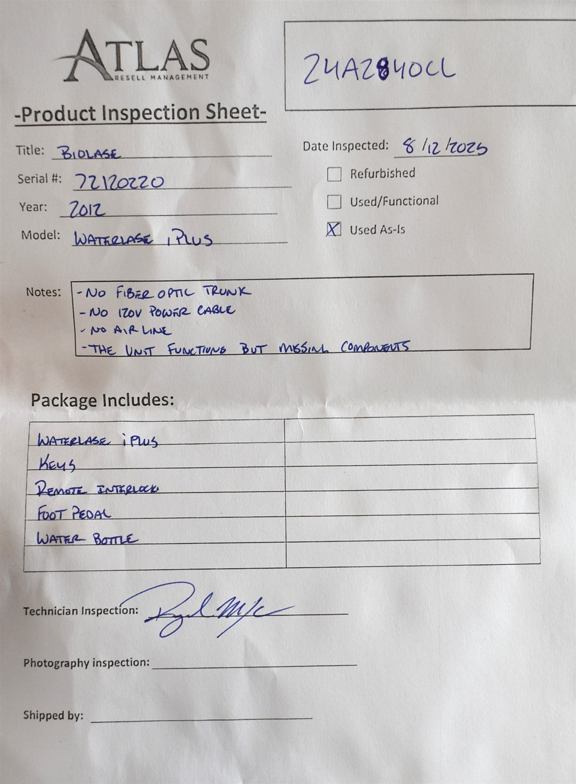 Your purchase will NOT include: Fiber Trunk, Keys, Remote Interlock, Foot Pedal, Water Bottle - other accessories not shown or listed here.Biolase Waterlase iPlus – Dental Laser SystemKey FeaturesAdvanced laser technology for precise soft and hard tissue procedures.Minimally invasive treatment for patient comfort and faster healing.User-friendly interface with customizable settings for various procedures.Durable design for reliable daily use in dental practices.Biolase Waterlase iPlus – Efficient, precise, and versatile laser dentistry.This unit was function tested and found to be functional. This unit does not come with a fibertrunk, 120v Power Cable, Air Line. Used as-is.