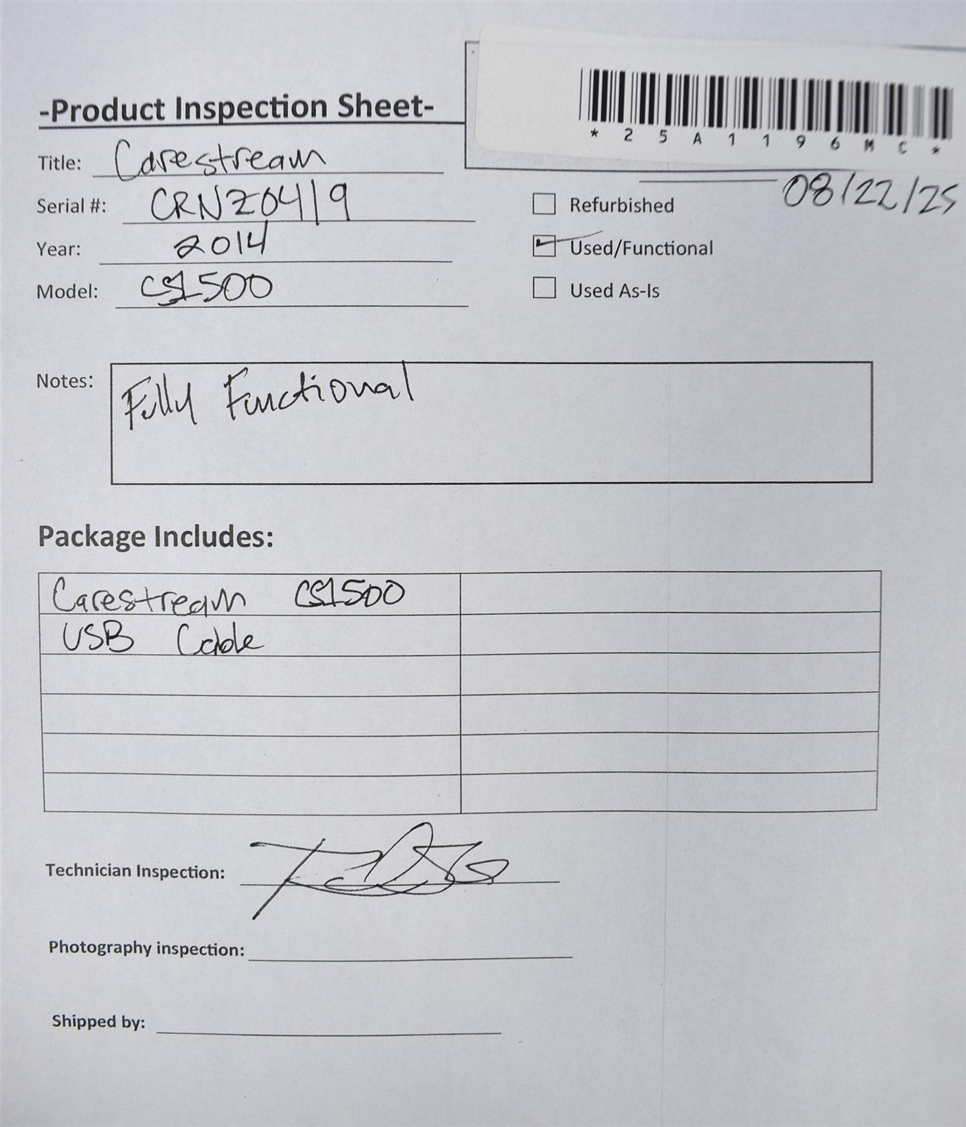 Your purchase will NOT include: This product is pre-owned and may not include the same accessories as a new, unused unit. - other accessories not shown or listed here. True Autofocus with Liquid Lens Technology: Automatically focuses like the human eye—no manual adjustments needed. Superior Image Resolution: 1024 × 768 still images, offering exceptional detail for patient education and diagnostics. Wide Focus Range: From 1 mm to infinity—captures full-arch to macro views with sharp clarity. Auto-Adjusting 8-LED Lighting: Optimizes illumination and contrast for true-to-life color in any environment. Wired or Wireless Options: Available in both configurations for flexible setup and sharing between operatories. One-Button Image Capture: Simple ergonomics—capture and save images via USB or SD card with a single button press. Lightweight & Ergonomic Design: Comfortable handpiece (around 61 g) with easy maneuverability—even in hard-to-reach areas. TWAIN Compliant: Seamlessly integrates with Carestream software and third-party dental imaging systems.Visually inspected the unit for any damages or missing parts and accessories.