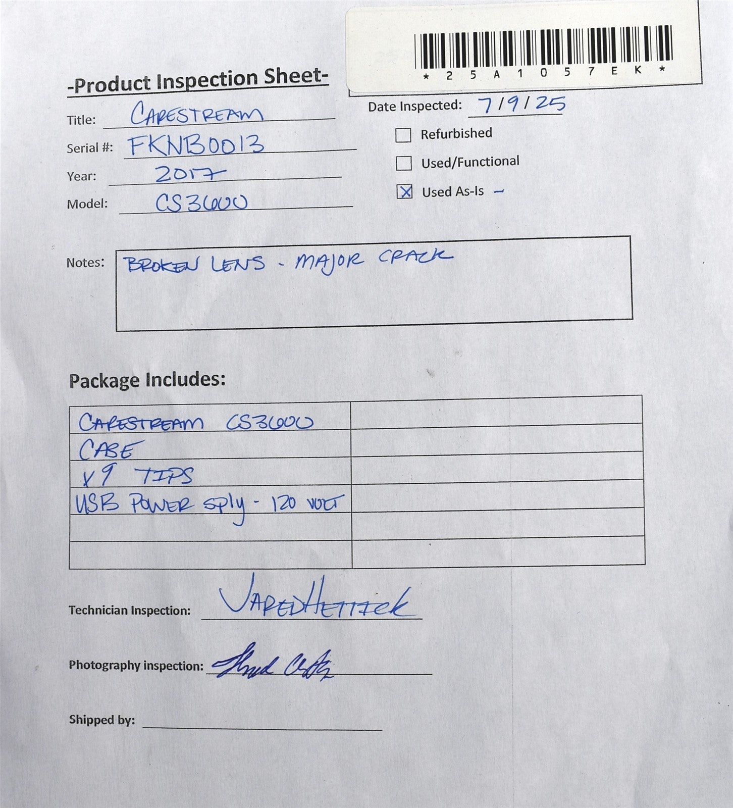Carestream CS3600 was oprned and inspected, Broken lens, i opened the case. and looked over the unit, and found the lens is cracked horizontally in direct middleI. NONFUNCTIONAL PARTS ONLY.