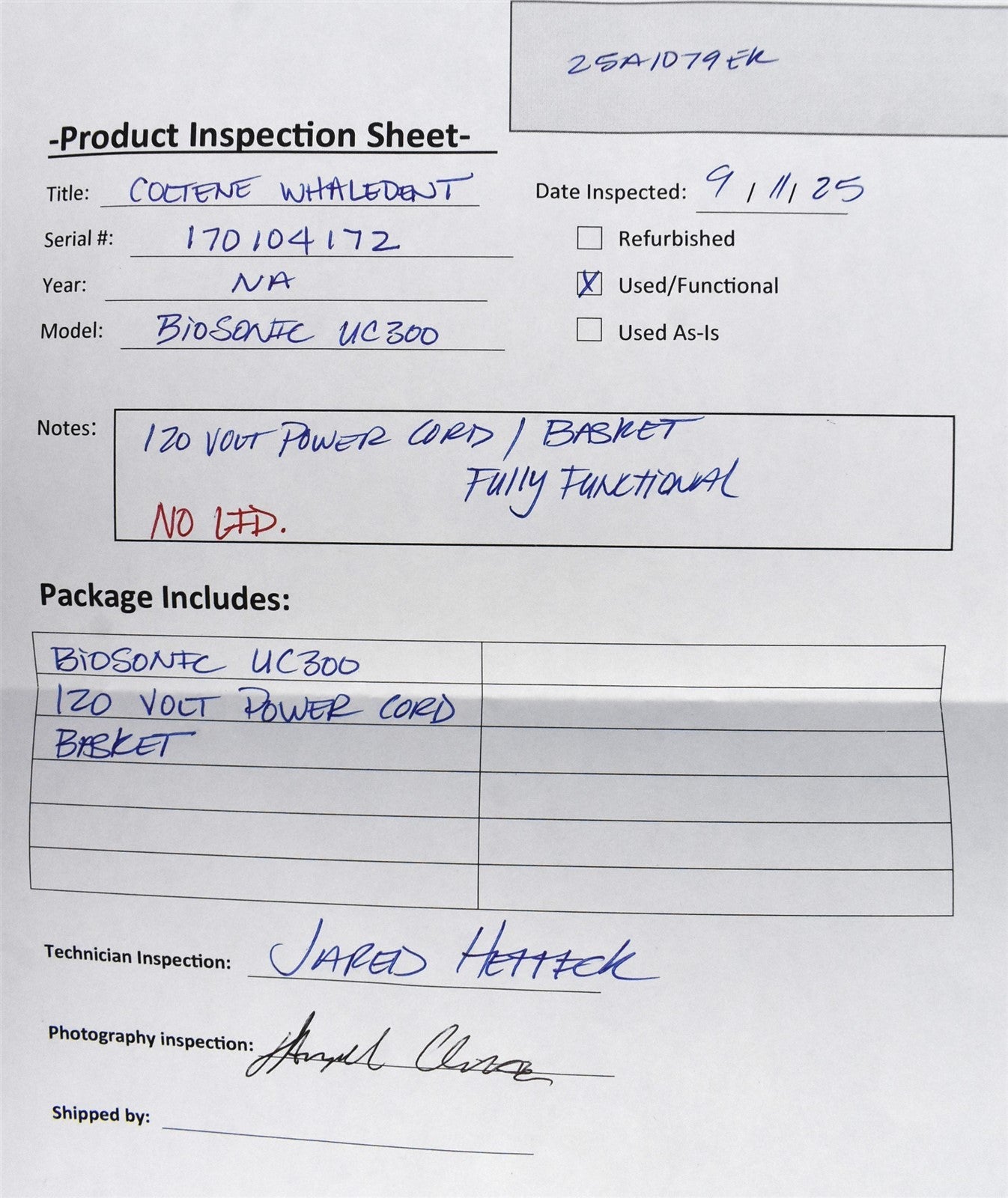 Coltene BioSonic UC300, Fill the UC300B tank with warm water up to the fill line.Add your usual ultrasonic cleaning solution (BioSonic General Purpose, Enzymatic, or Germicidal). Ensure the unit is not running dry—this can damage the transducers. Use standard aluminum foil (household grade).Cut strips approximately 2" x 10".Suspend the foil vertically into the tank using rods or tape, ensuring they don’t touch the tank bottom. The unit has been cleaned and disinfected. Inspection Result: - Ready for Resale.