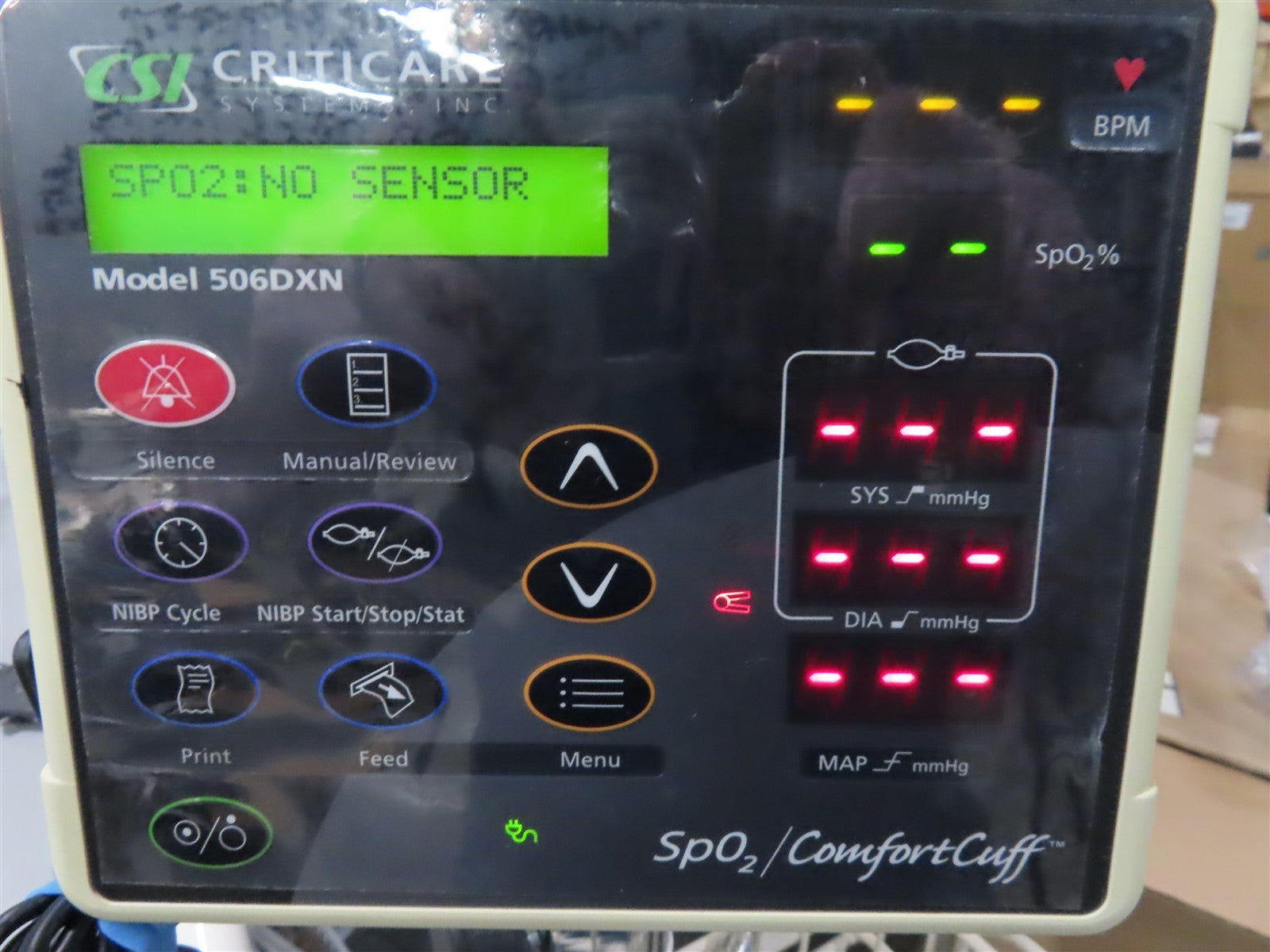 Your purchase will NOT include: - other accessories not shown or listed here.The unit was successfully powered on and underwent a comprehensive functionality check. All control buttons were tested and confirmed operational, and the display screen was inspected for visual integrity with no defects observed. The SpO₂ sensor was connected and verified to function correctly. Additionally, all three NIBP cuffs were individually tested and demonstrated proper performance. The printer was tested and functions correctly. Overall, the device is fully operational; however, one caster is broken, and a suitable replacement could not be sourced.