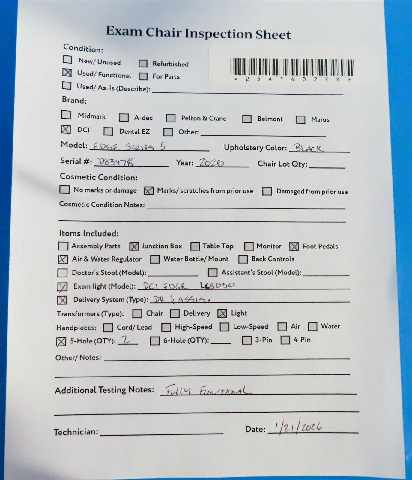 - Exam Chair Serial Number: D83478