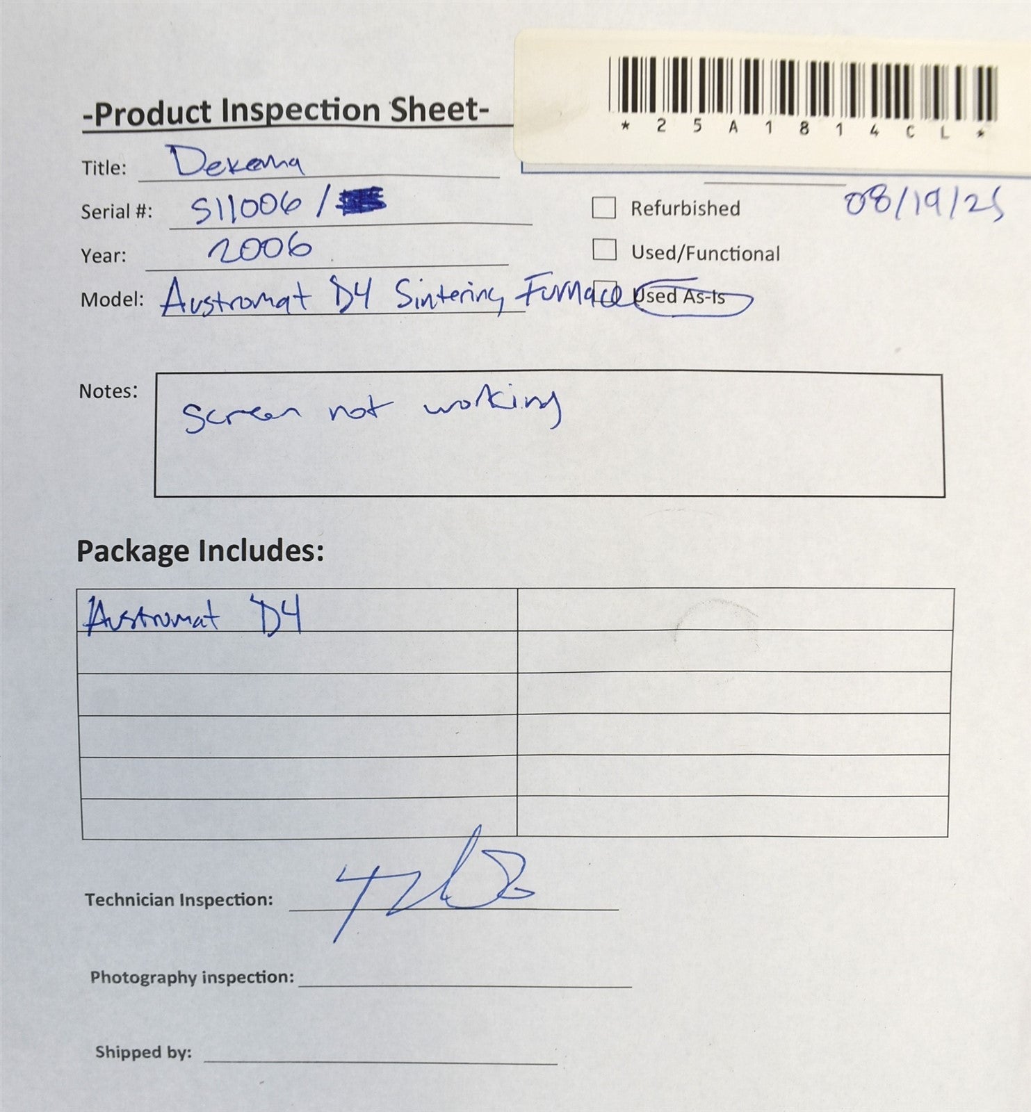 Your purchase will NOT include: - other accessories not shown or listed here. Dekema Austromat D4 Dental Porcelain Furnace High-performance furnace for firing, glazing, and crystallization Vacuum technology for precise ceramic processing Advanced touchscreen interface with intuitive controls Multiple program memory storage for customized firing cycles Even heat distribution for consistent firing results Compact benchtop design ideal for dental laboratories Durable construction engineered for long service life Compatible with a wide range of dental ceramics and materials Reliable German engineering from DekemaPowered on unit and noticed display screen was not properly working. Chamber was able to open and shut.