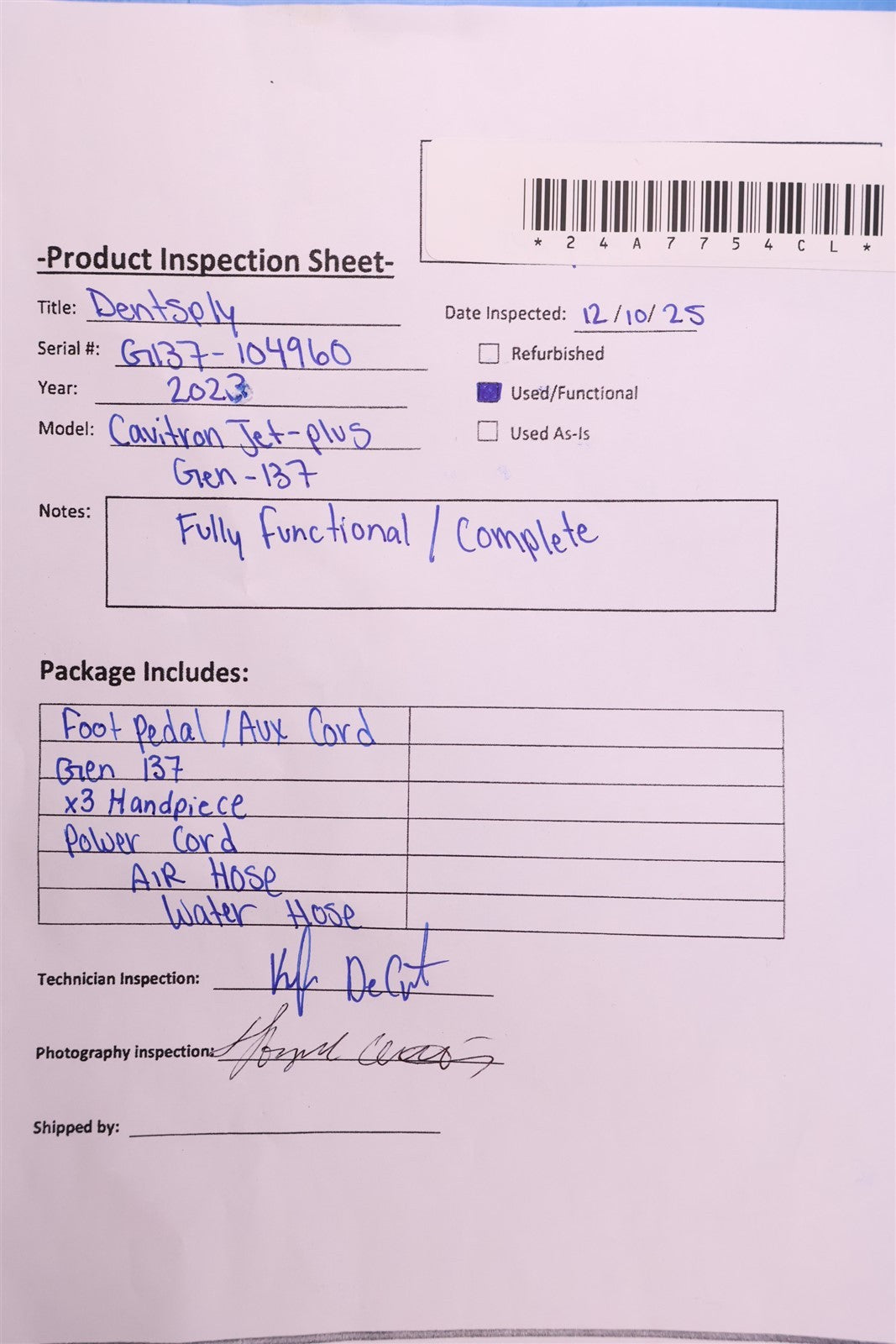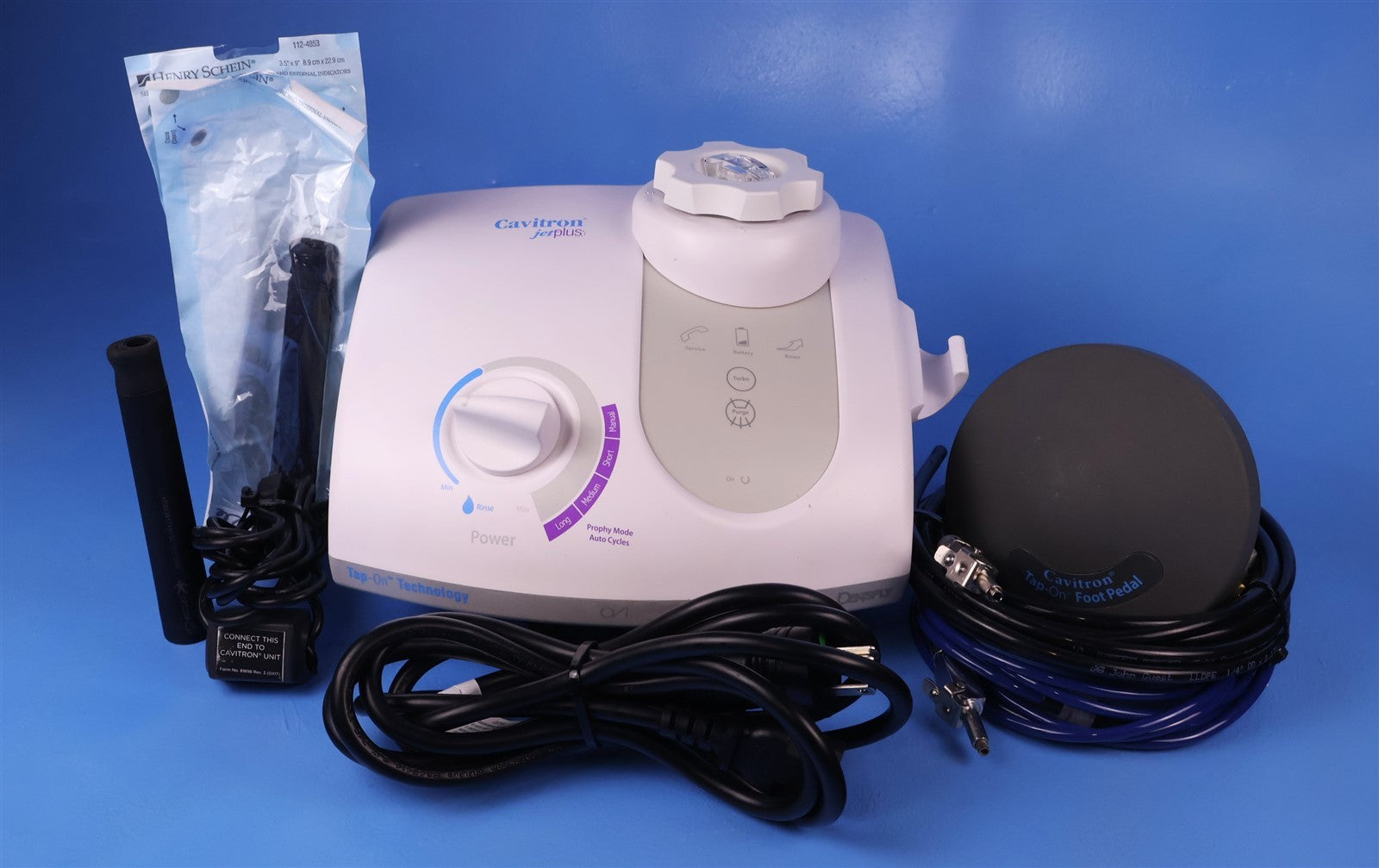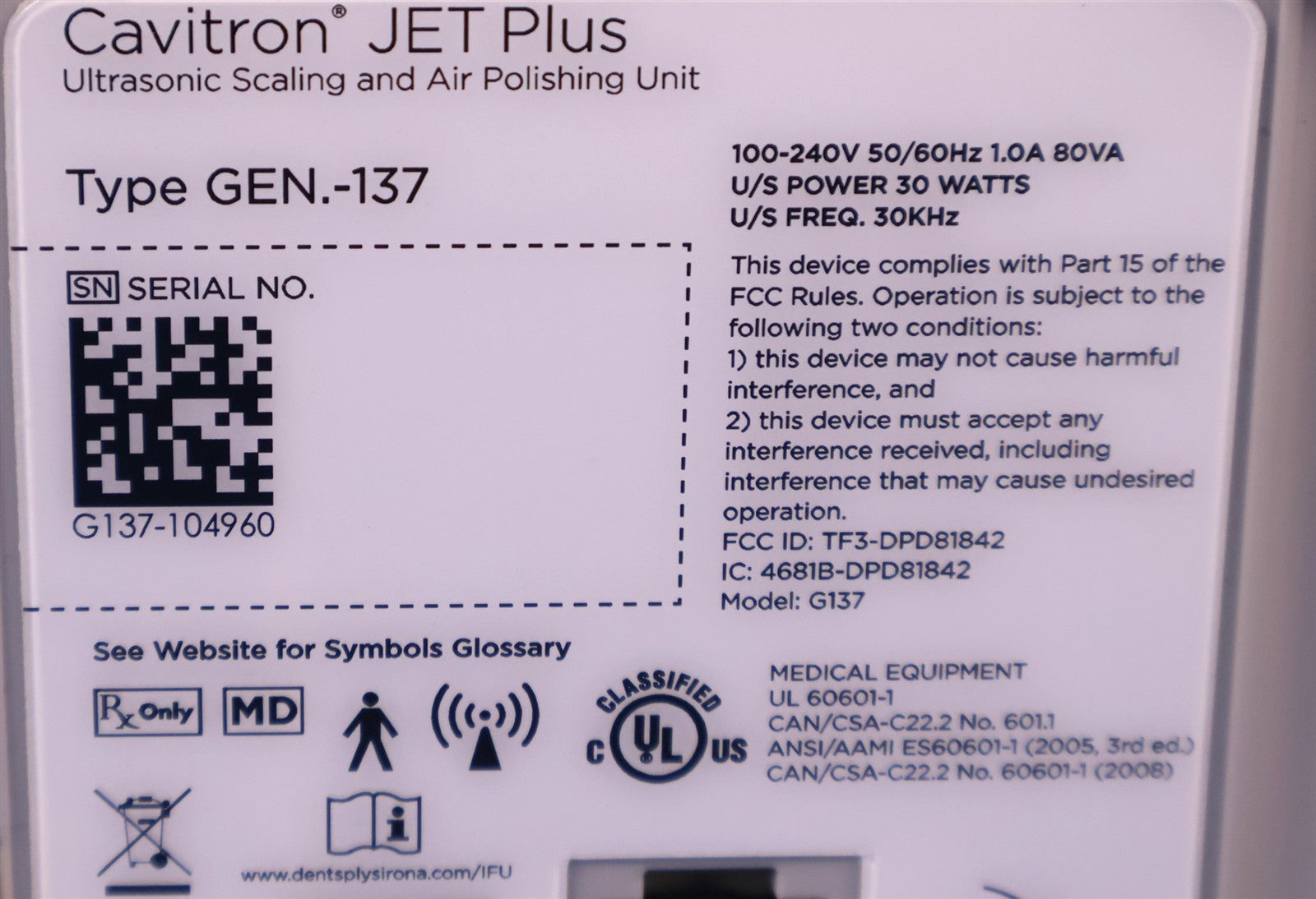 Your purchase will NOT include: This product is pre-owned and may not include the same accessories as a new, unused unit. - other accessories not shown or listed here.Visually inspected this Dentsply Cavitron Jet Plus Gen-137 for any missing parts or damage that would interfere with the units complete designated functionality. Unit is complete, and in GREAT CONIDITON. Prophy reservoir hasn't been used. I then properly set this unit up, connecting to compressed air and water, 120 power source, and Cavitron 30K JET-Mate handpiece. Tested handpiece with both prophy tip and scaling tip. When foot pedal is engaged it triggers hanpdiece function. Water dispenses from tip correlating with desired setting. FINAL PRODUCT INSPECTION STATUS= PASSED/ FULLY FUNCTIONAL. -