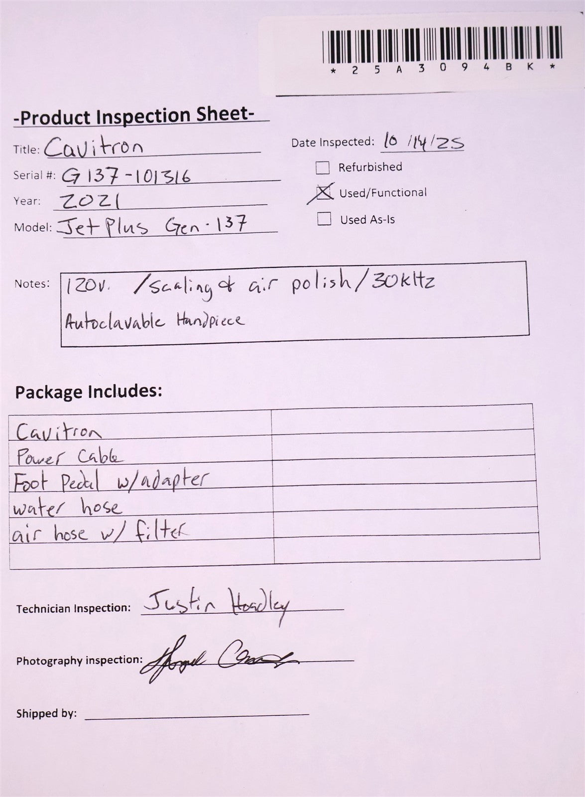 Your purchase will NOT include: This product is pre-owned and may not include the same accessories as a new, unused unit. - other accessories not shown or listed here.The unit was successfully powered on and connected to both water and air supplies. Functional testing was conducted on the handpiece, foot pedal, and all control buttons. Each component responded appropriately, confirming that the system is operating within expected parameters.
