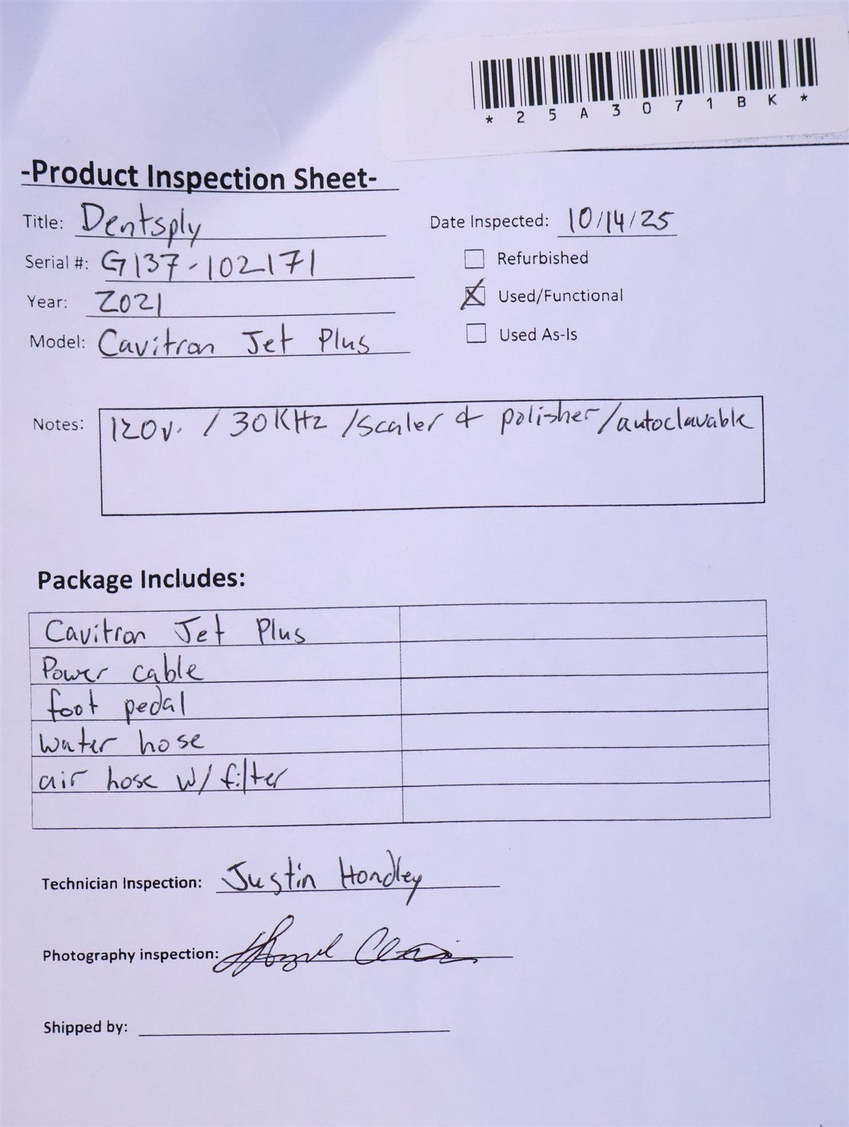 Your purchase will NOT include: Foot Pedal Cable AdapterThis product is pre-owned and may not include the same accessories as a new, unused unit. - other accessories not shown or listed here.The unit was successfully powered on and connected to both air and water supplies. All control buttons and indicator lights were inspected and confirmed to be fully functional. The foot pedal operated as intended, and a handpiece was connected and tested, verifying proper performance across all integrated systems.