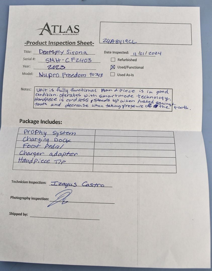 Unit is fully functional handpiece is in good condition. Operates with smart mode technology. Handpiece is cord less speeds up when pushed against tooth and decrease when taking pressure off the tooth. Does not have a power cable but can be purchased at any local store.