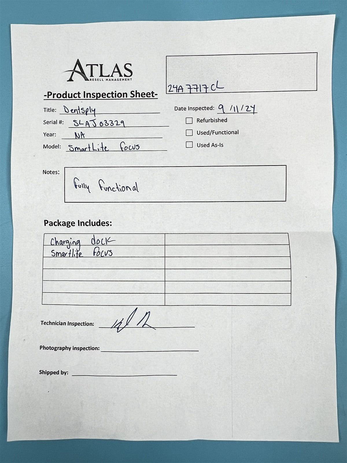 Your purchase will NOT include:Light Shield This product is pre-owned and may not include the same accessories as a new, unused unit. - other accessories not shown or listed here.Attached charging dock to required 120V power source, placed handheld curing light on dock to ensure receives charge. Upon placing unit on dock, power button illuminated green indicating receiving charge. Removed unit from dock, powered unit on. Units light came on immediately, placed tip on power intensity meter reading well over 400. Which is a normal output. Great condition. FULLY FUNCTIONAL.