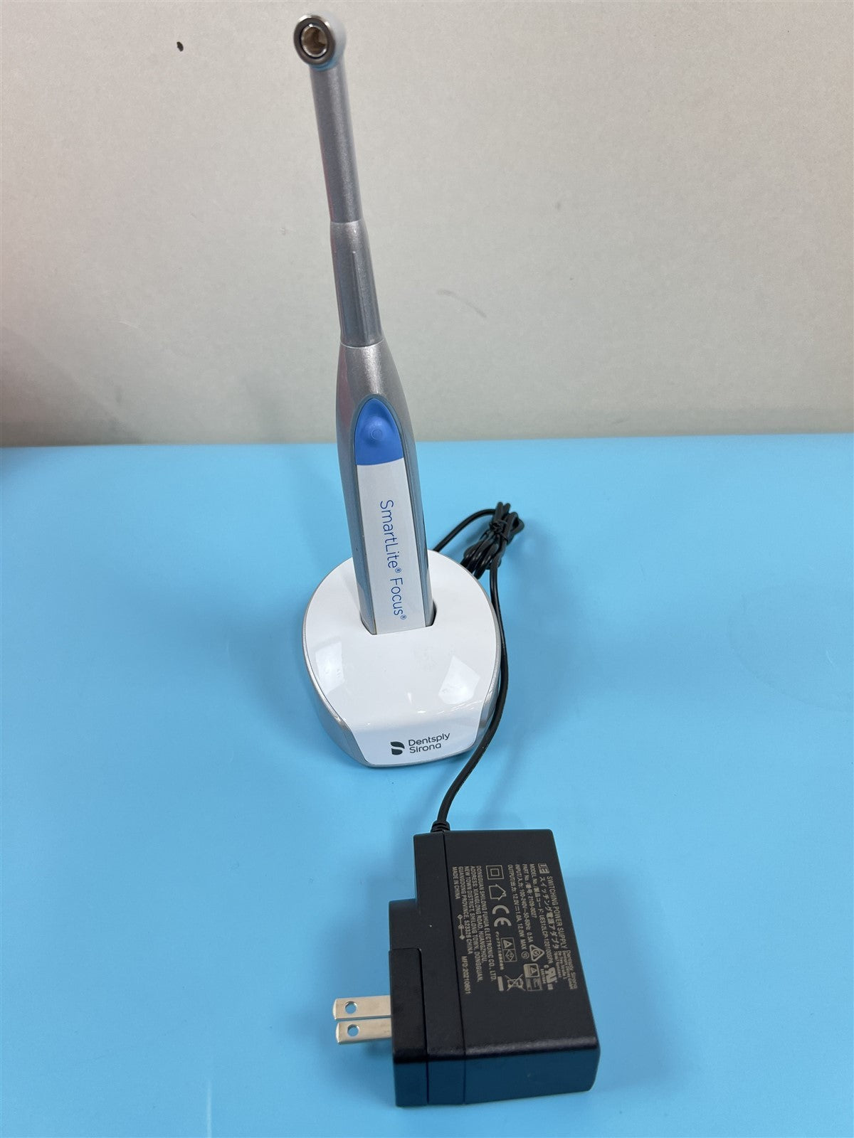 Attached charging dock to required 120V power source, placed handheld curing light on dock to ensure receives charge. Upon placing unit on dock, power button illuminated green indicating receiving charge. Removed unit from dock, powered unit on. Units light came on immediately, placed tip on power intensity meter reading well over 400. Which is a normal output. Great condition. FULLY FUNCTIONAL.