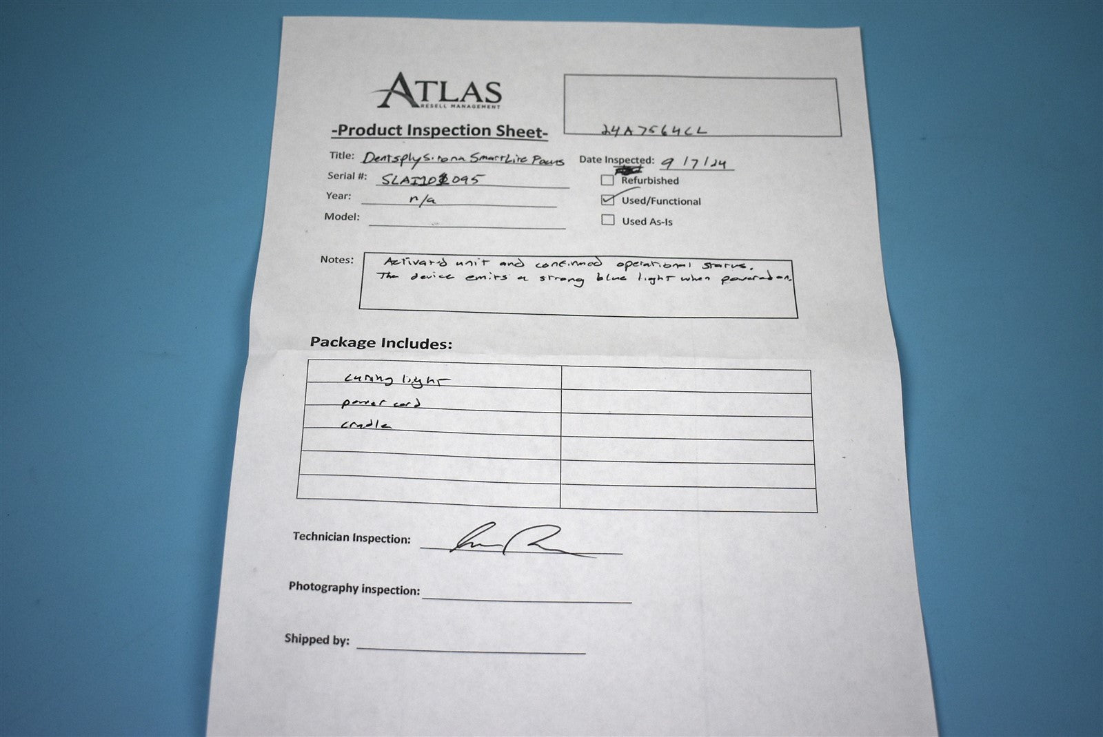 Your purchase will NOT include:This product is pre-owned and may not include the same accessories as a new, unused unit. - other accessories not shown or listed here.Activated the unit and verified operational status. The device emits a bright blue light when the power button is in the "on" position.