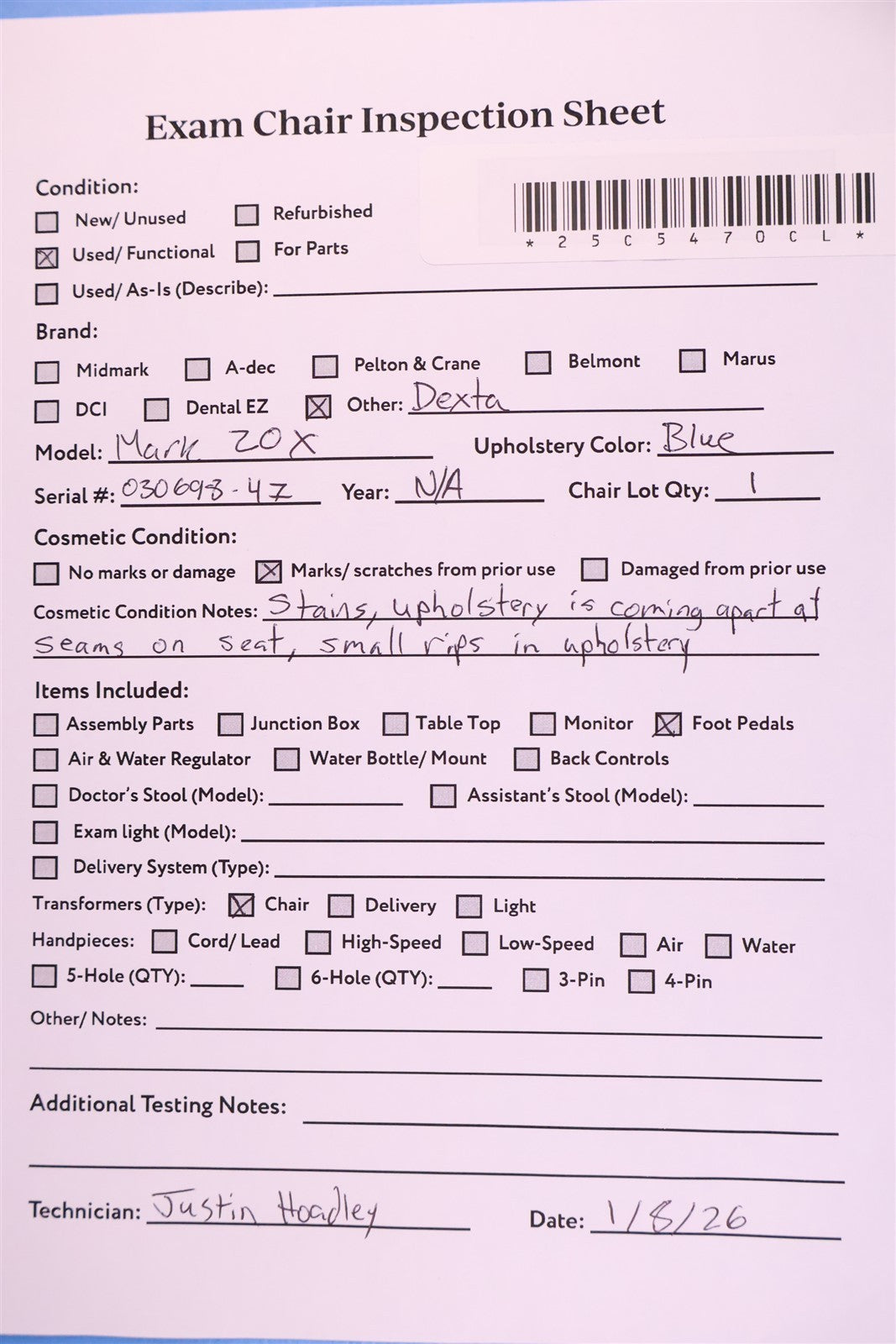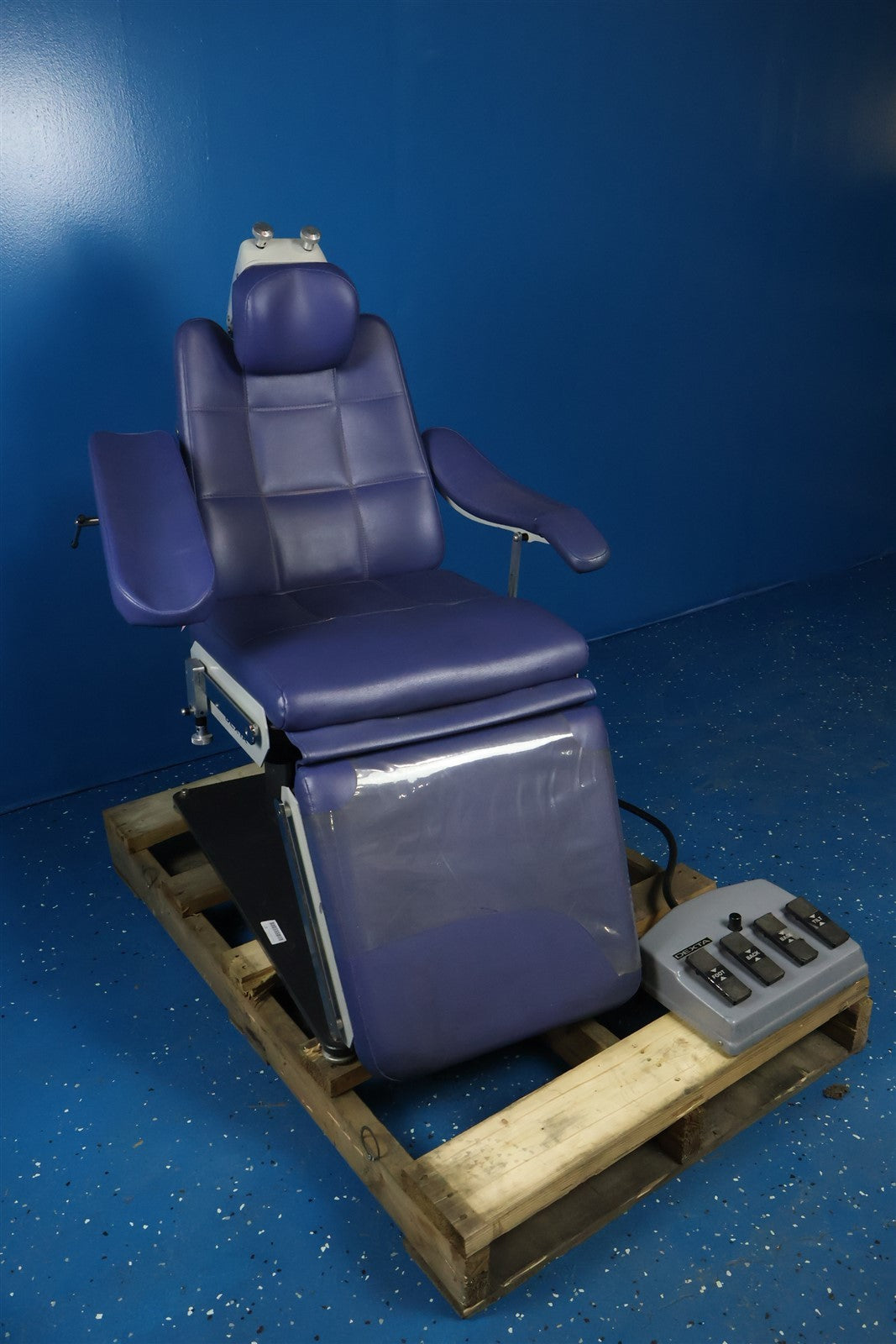 The unit was powered on and the foot pedal was tested. All operational functions performed correctly. The chair elevates and lowers smoothly, the backrest operates properly, and the footrest moves through its full range without issue. All systems are functioning as intended.