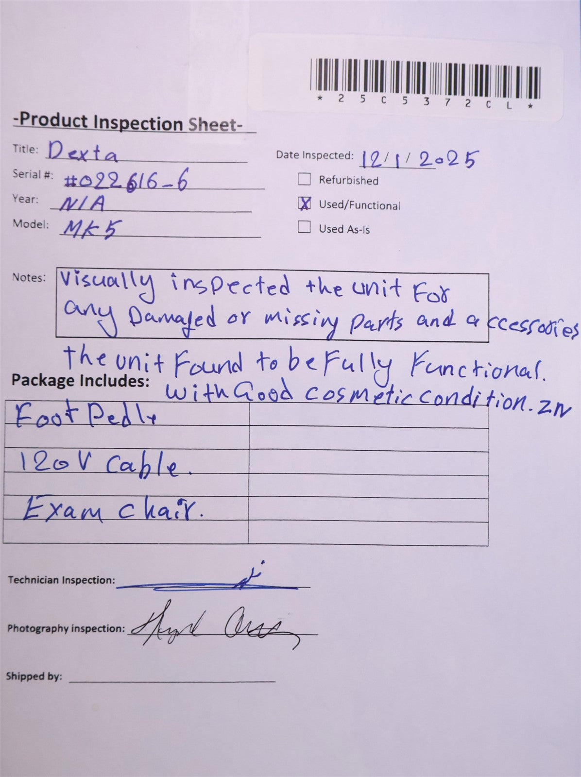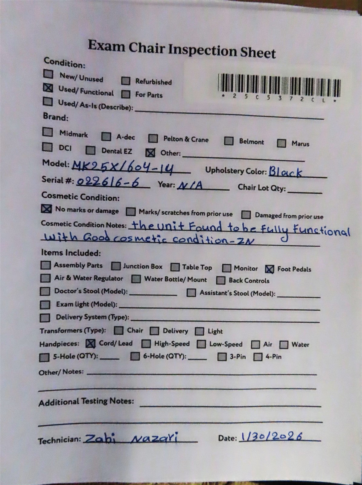 Foot Pedal, 120V Power Cable, Exam Chair.