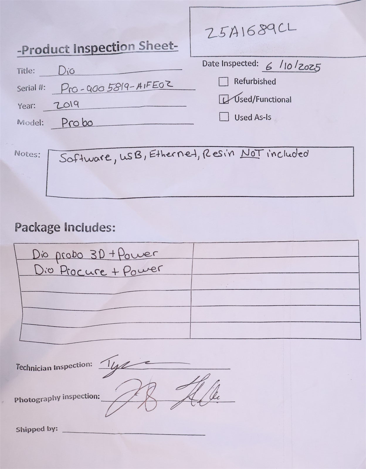 Your purchase will NOT include: software, USB, Ethernet, or resinThis product is pre-owned and may not include the same accessories as a new, unused unit. - other accessories not shown or listed here.We do not have resin to test this unit. So I navigated the menus and started a build without resin just to ensure the stage moves as intended. That is the extent of our test. This unit does NOT include software, USB, Ethernet, or resin. Software may need to be purchased from the manufacturer that could possibly mean some additional cost. Cosmetically this item is in fair condition because it has resin throughout the unit and marks. ProCure: Item turns on, curing light turns on and everything functions as normal. Unit is in fair condition as it has resin on the buttons but doesnt effect the unit. Fair condition, Marks throughout.