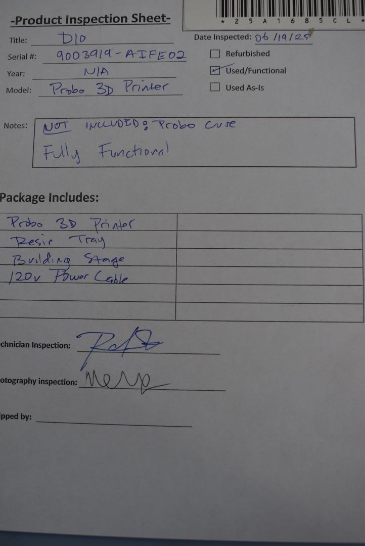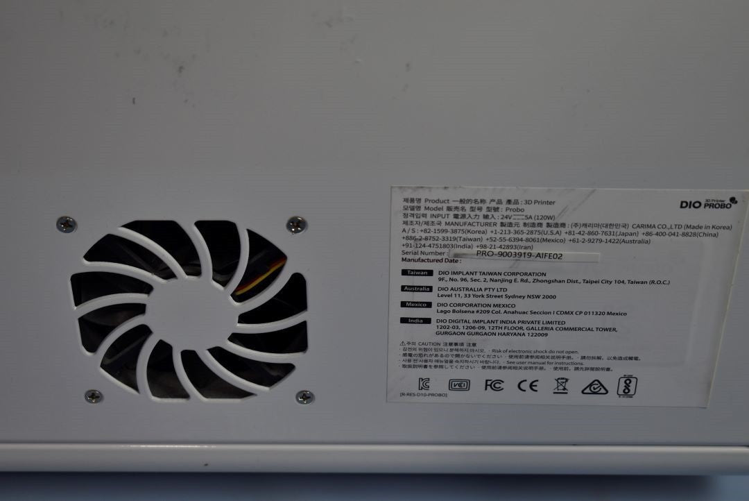 Your purchase will NOT include:Probo CureThis product is pre-owned and may not include the same accessories as a new, unused unit. - other accessories not shown or listed here. DIO PROBO Dental 3D Printing System High-resolution DLP printing using 1920 × 1080 Full HD light modulator Precise output with XY resolution ~55–65 µm; Z-axis layer down to 25 µm Compact, chairside-friendly design: approx. 300 × 378 × 484 mm (or 35 × 55 × 33 cm), weight 20–30 kg Automated material recognition via RFID for optimized settings Intuitive touch-screen interface with LAN/Wi-Fi support for remote monitoring Ideal for producing surgical guides, models, crowns, bridges, denture bases, and more Optional post-processing via dual-sided curing in the DIO PROBO Cure 2
