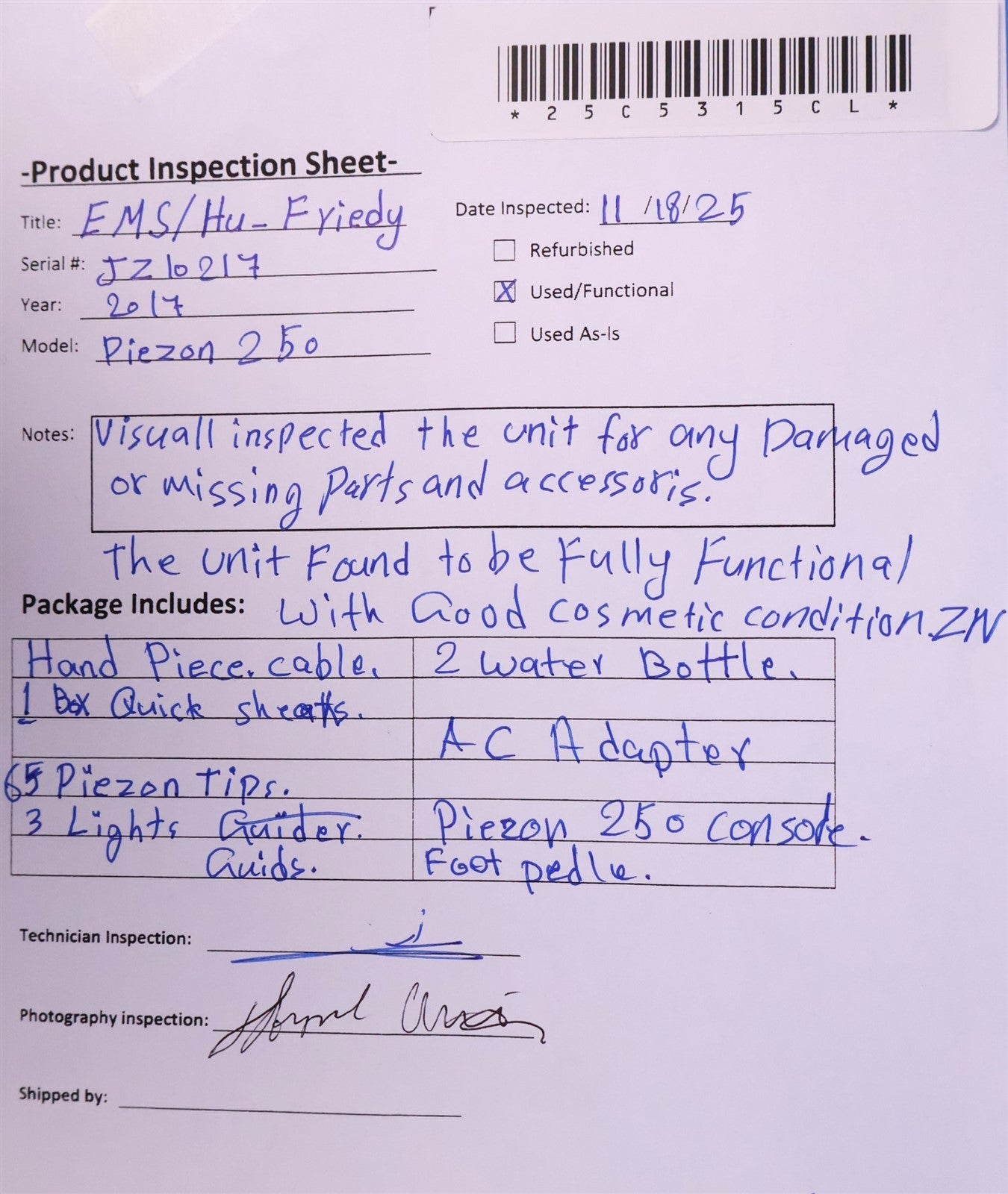 Visually inspected the unit for any damaged or missing parts and accessories. Function tested the unit and found to be fully functional with good cosmetic condition.