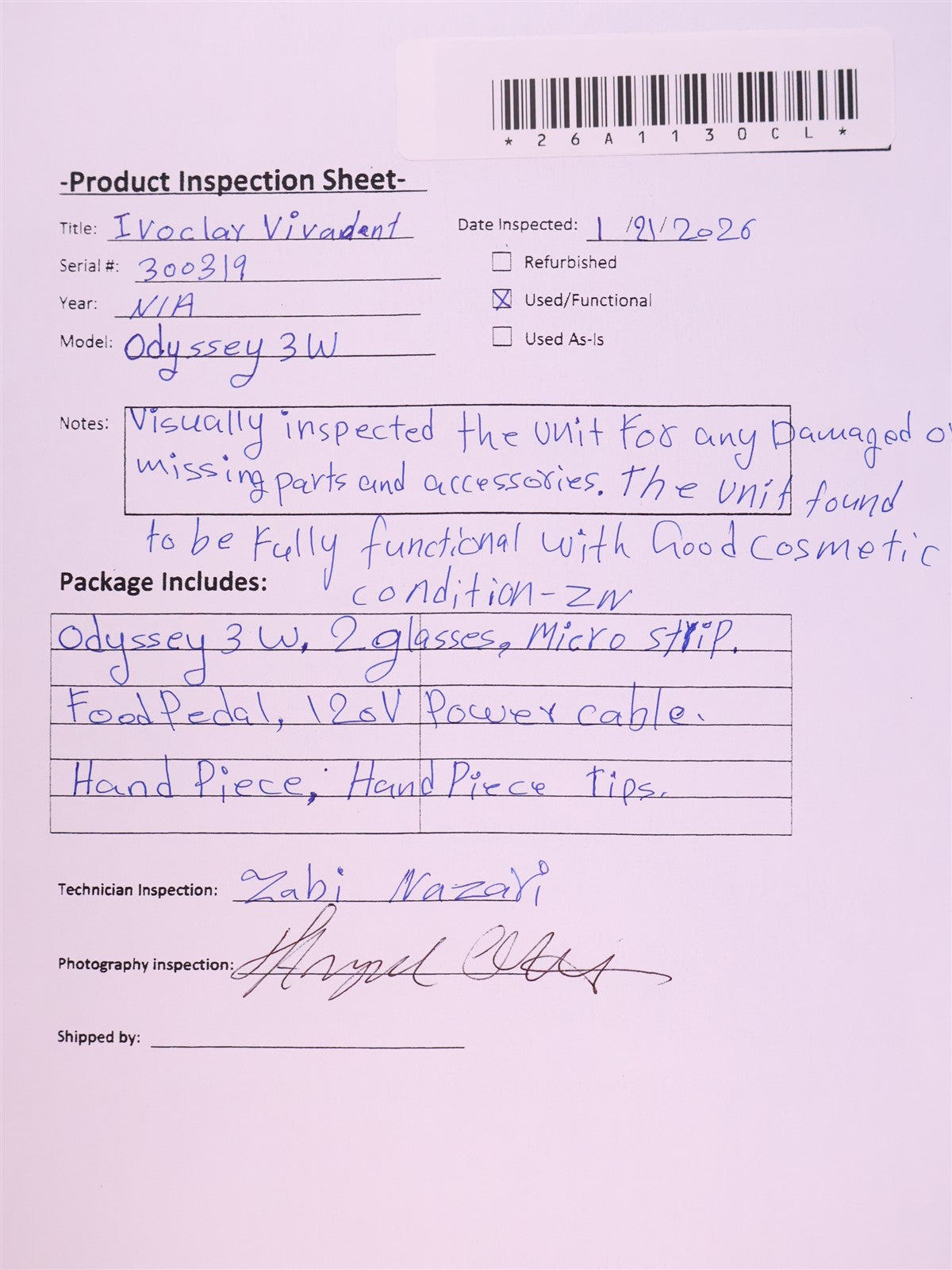 Odyssey 3 W, 2 Safety Glasses, Micro Strip, Foot Pedal, Handpiece, Handpiece tips, 120V Power cable.