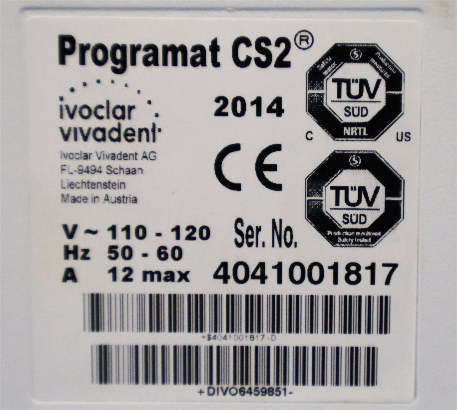 Ivoclar Vivadent Programat CS2, Vacuum Pump, 120V AC Power Cord.