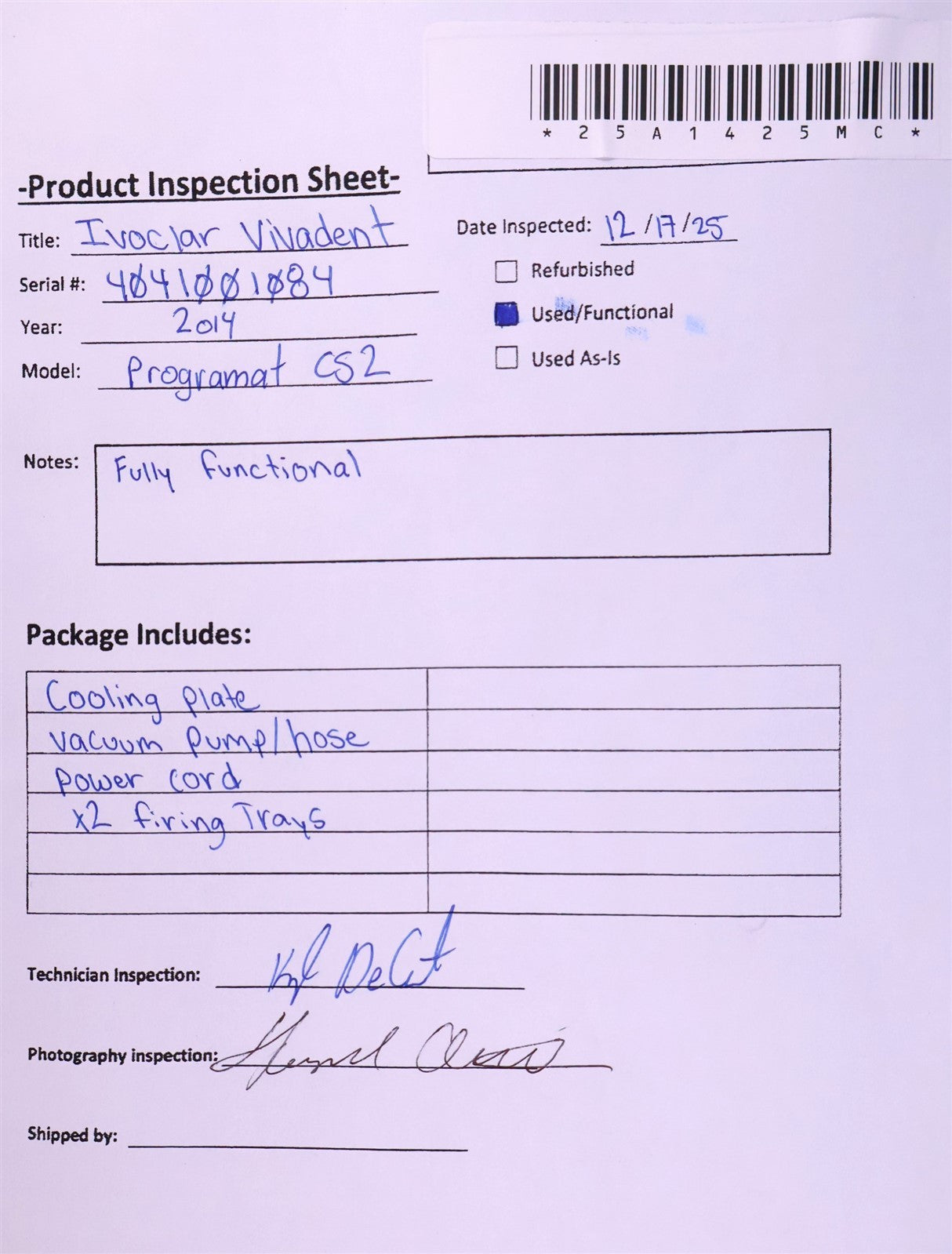 Your purchase will NOT include: FORCEPTSThis product is pre-owned and may not include the same accessories as a new, unused unit. - other accessories not shown or listed here.Prior to function testing this Ivoclar Vivadent Programat CS2, it was visually inspected for any damage or missing parts that would interfere with units complete desired functionality. Unit is COMPLETE and free of significant damage. Properly set unit up, powered unit on. Unit successfully powered on, passing self test. Units TOUCH SCREEN DIGITAL DISPLAY illuminated a clear interface, that responds when interacted with. Unit did require dehumidification and temperature calibration. Unit successfully completed both maintenance programs with no complications. This Ivoclar Vivadent Programat CS2 is free of significant damage and in great mechanical condition. FINAL PRODUCT INSPECTION STATUS- PASSED/ FULLY FUNCTIONAL.