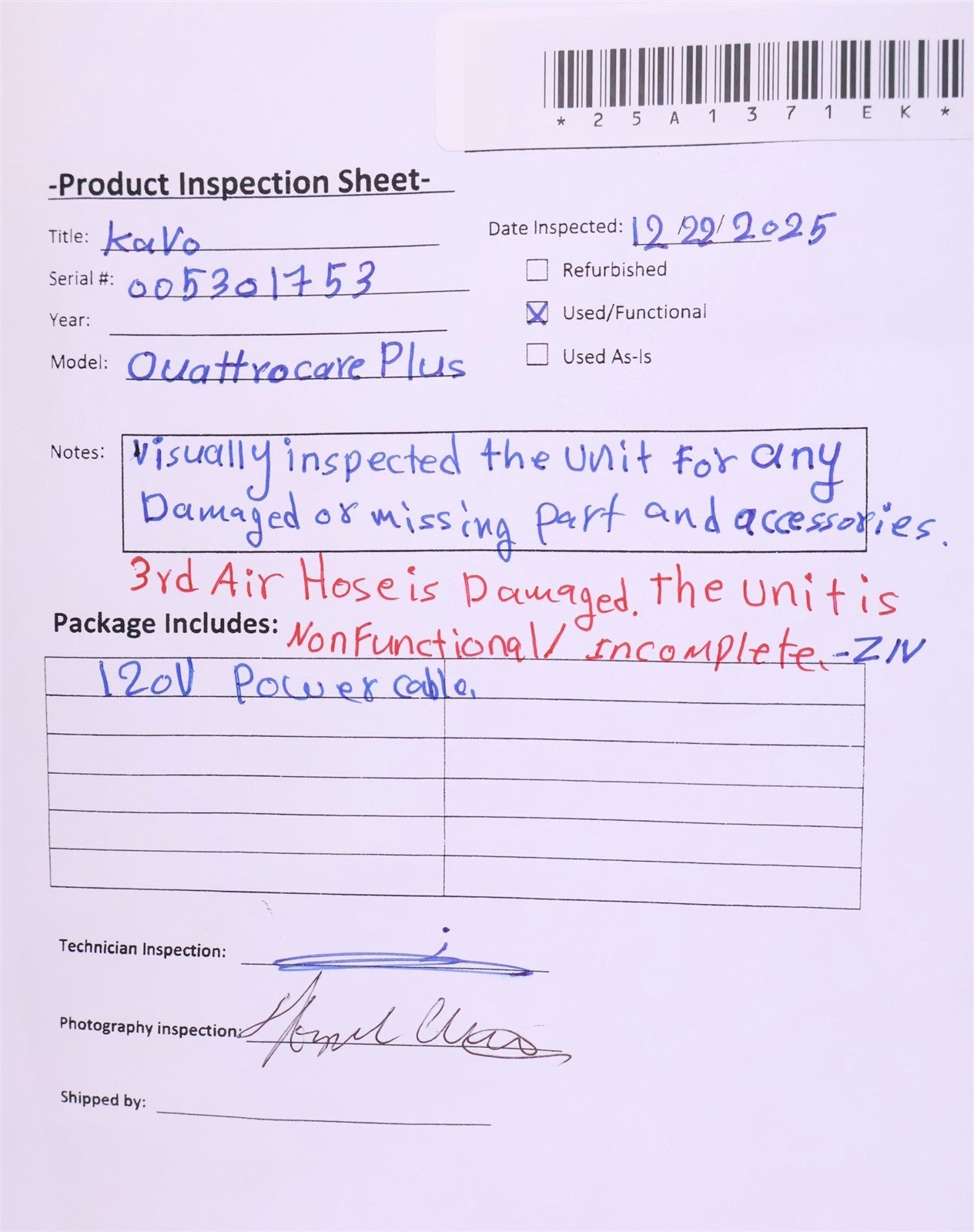Visually inspected the unit for any damaged or missing parts and accessories . 3rd Air Hose is damaged, the unit is Nonfunctional/ Incomplete.-ZN