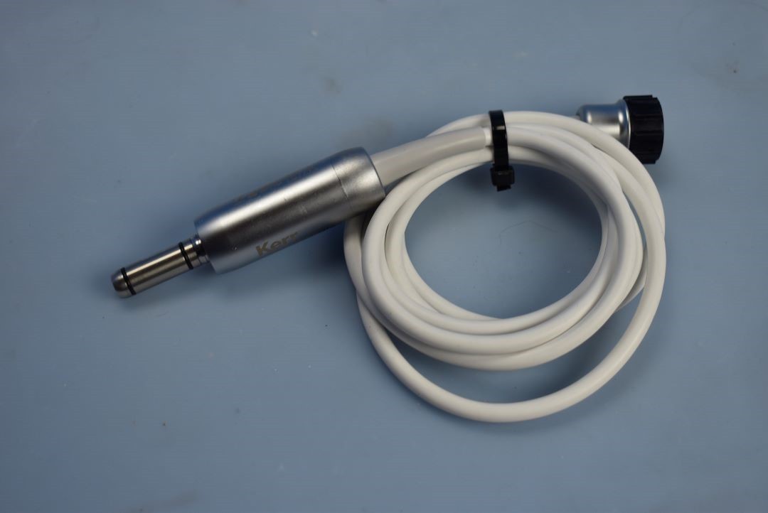 The Kerr AEU-28KER was inspected for its motor functionality and overall condition. The handpiece motor and sheath rotate at appropriate rates without delays or grinding. The condition of this unit is excellent with no damage and minimal marks. Inspection Result: Passed - Ready for Resale