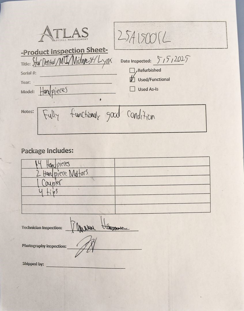 Your purchase will NOT include: N/AThis product is pre-owned and may not include the same accessories as a new, unused unit. - other accessories not shown or listed here.These handpieces were inspected for motor functionality and overall condition. Each piece in this unit was able to rotate at an appropriate rate. Each item is in good condition with light scratches and marks on their surfaces. Inspection Result: Passed - Ready for Resale
