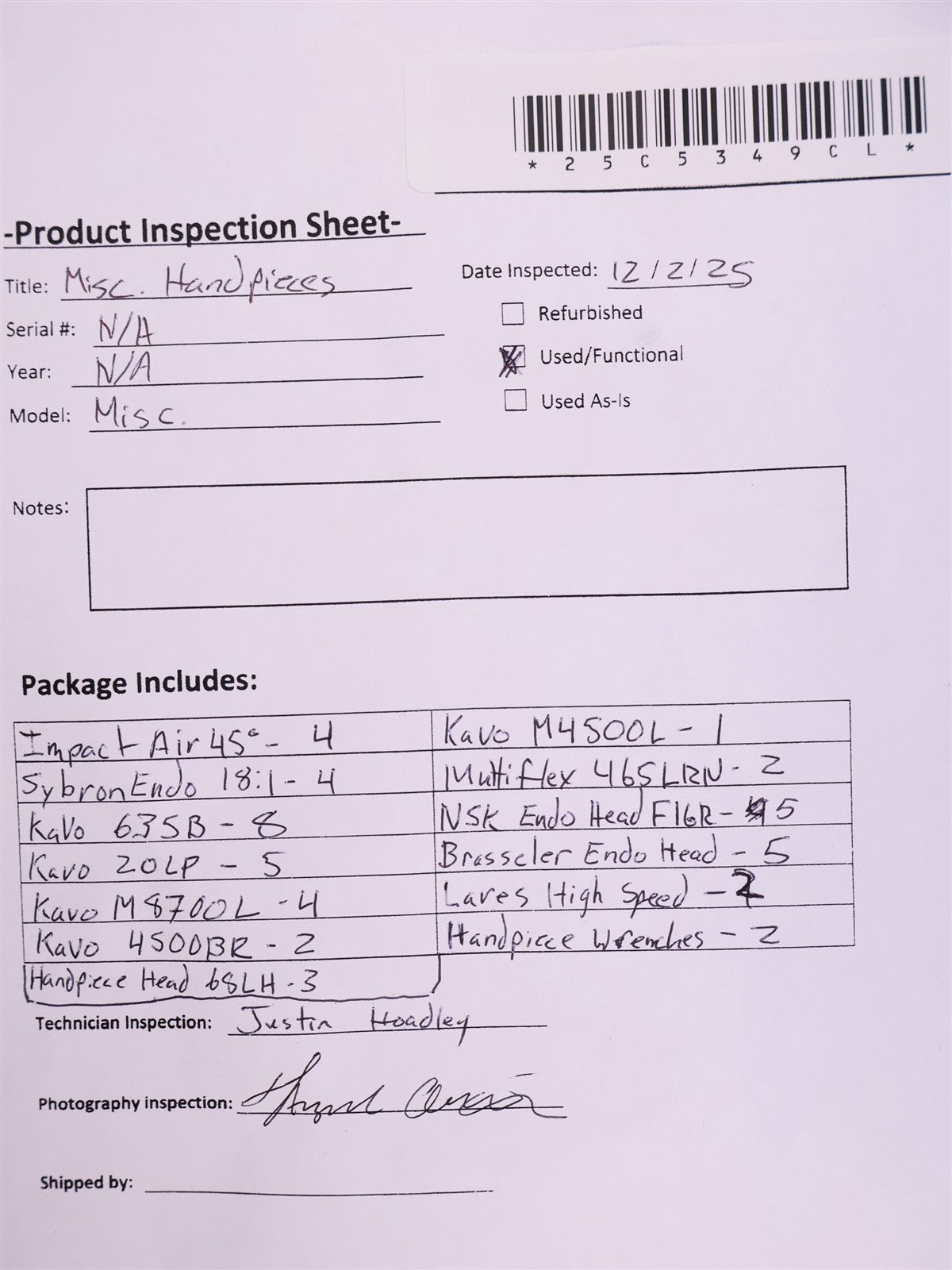 Impact Air 45 - 4; SybronEndo 18:1 - 4; KaVo 635B - 8; KaVo 20LP - 5; KaVo M8700L - 4; KaVo 4500BR - 2; KaVo M4500L - 1; MULTIflex 465LRN - 2; NSK Endo Head F16R - 5; Brasseler Endo Head - 5; Lares High Speed - 2; Handpiece Head 68LH - 3 ; Handpiece Wrenches - 2