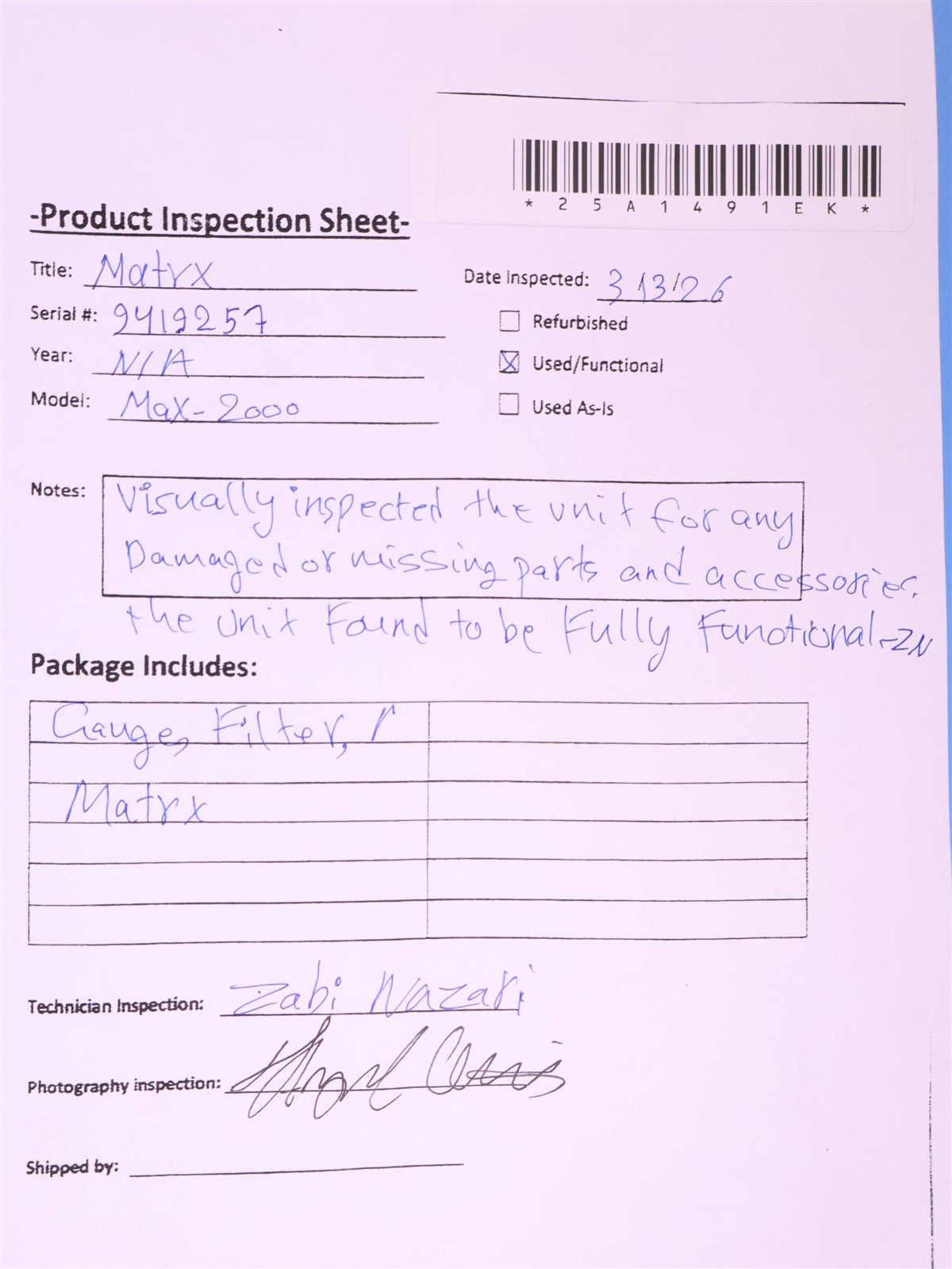 The unit was powered on visually inspected for any damaged or missing parts and accessories. I plugged the unit into 220V Power, the Motor runs smooth and works properly. the unit is fully functional-ZN