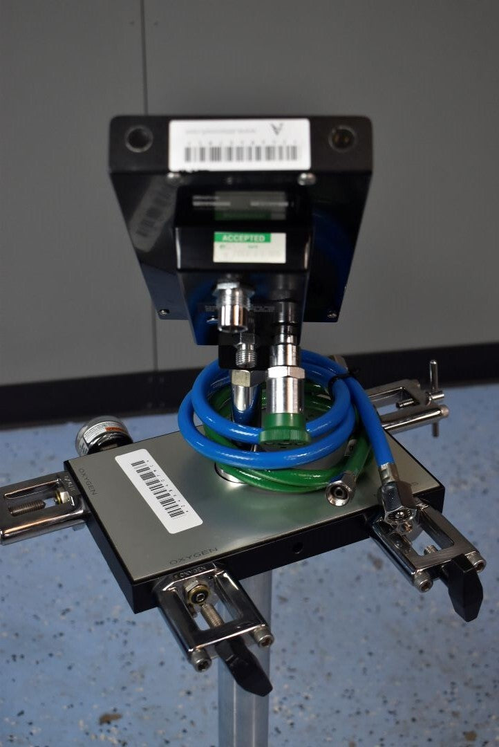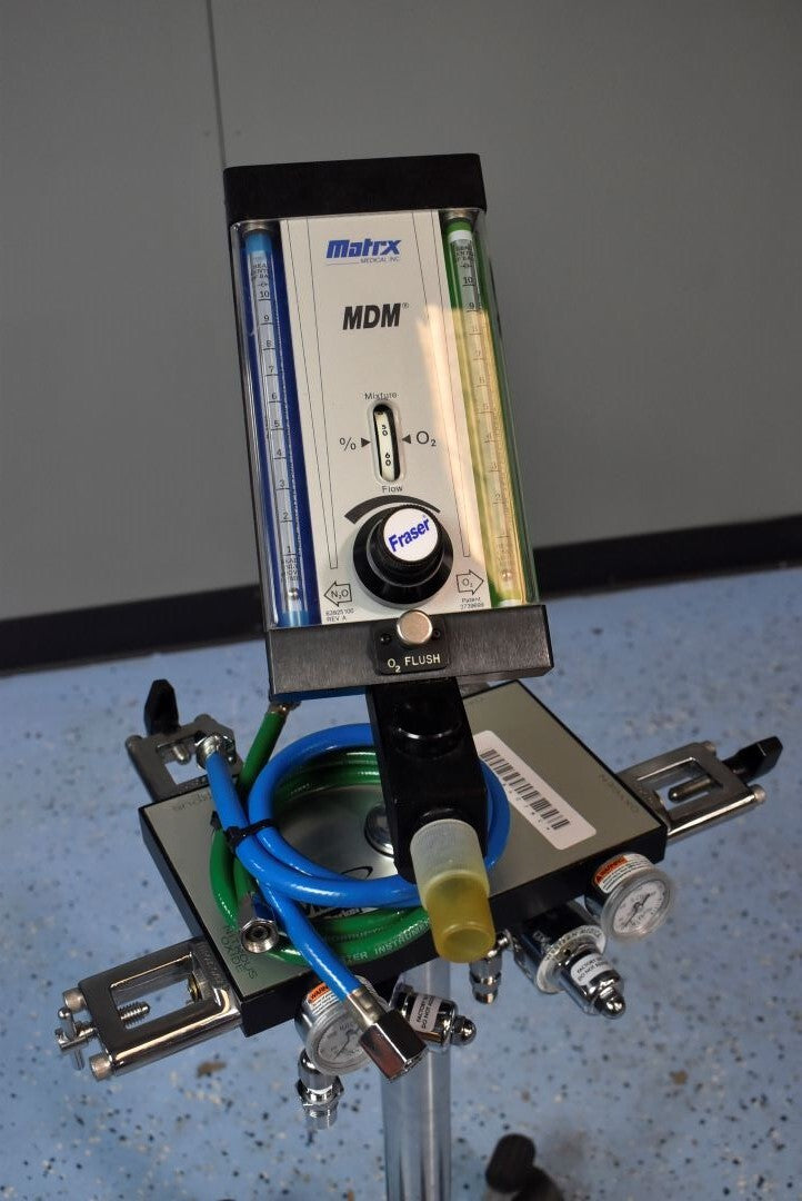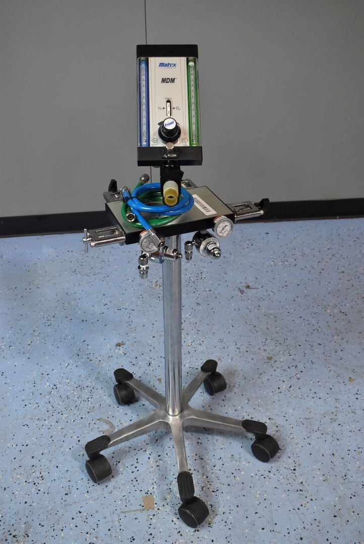 The Matrx MDM was refurbished by replacing the regulators with brand new ones and polishing and cleaning each surface. N20 and O2 flow through the block, regulators, and flowmeter without any leaks. The flowmeter is accurate and has no damage. There are some small scratches and dents that couldn't be removed. The block isn't fully secure, and so will rotate freely. Refurbishment Successful