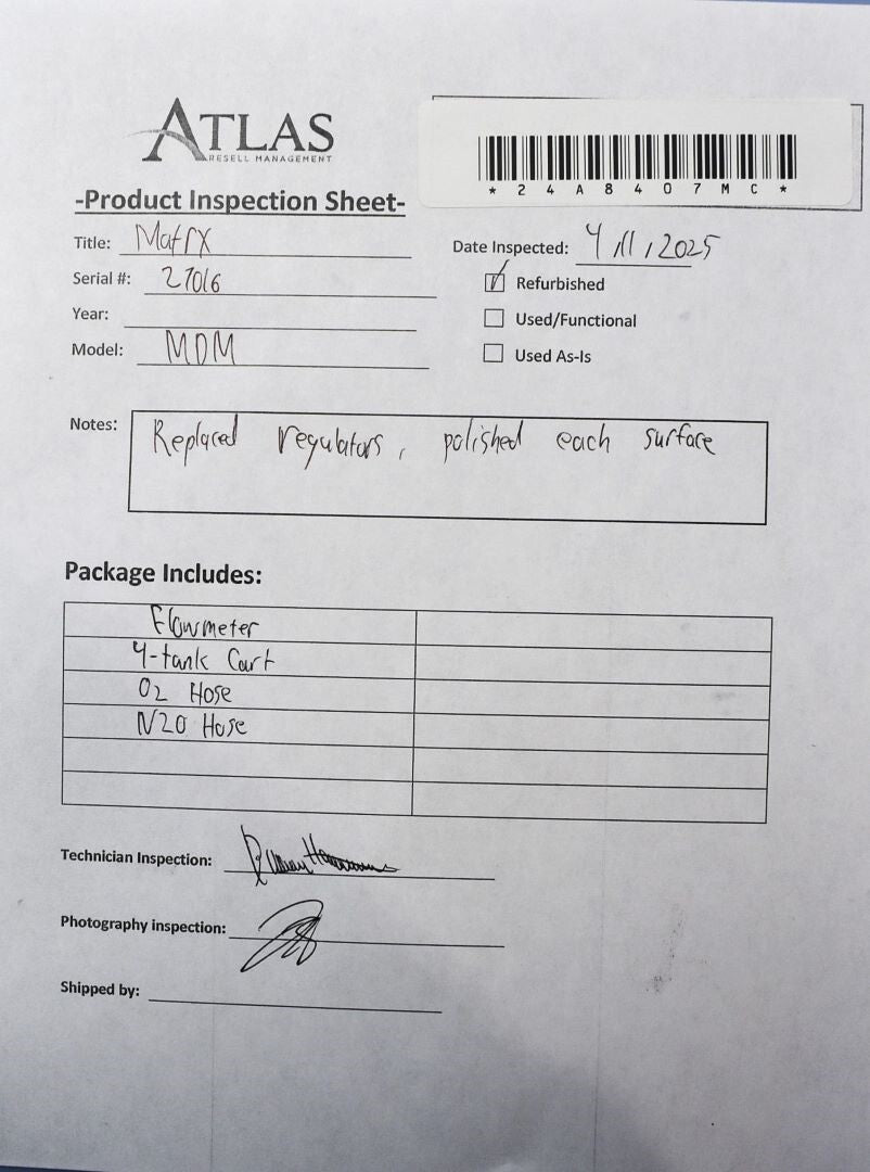 Your purchase will NOT include: N/A - other accessories not shown or listed here.The Matrx MDM was refurbished by replacing the regulators with brand new ones and polishing and cleaning each surface. N20 and O2 flow through the block, regulators, and flowmeter without any leaks. The flowmeter is accurate and has no damage. There are some small scratches and dents that couldn't be removed. The block isn't fully secure, and so will rotate freely. Refurbishment Successful