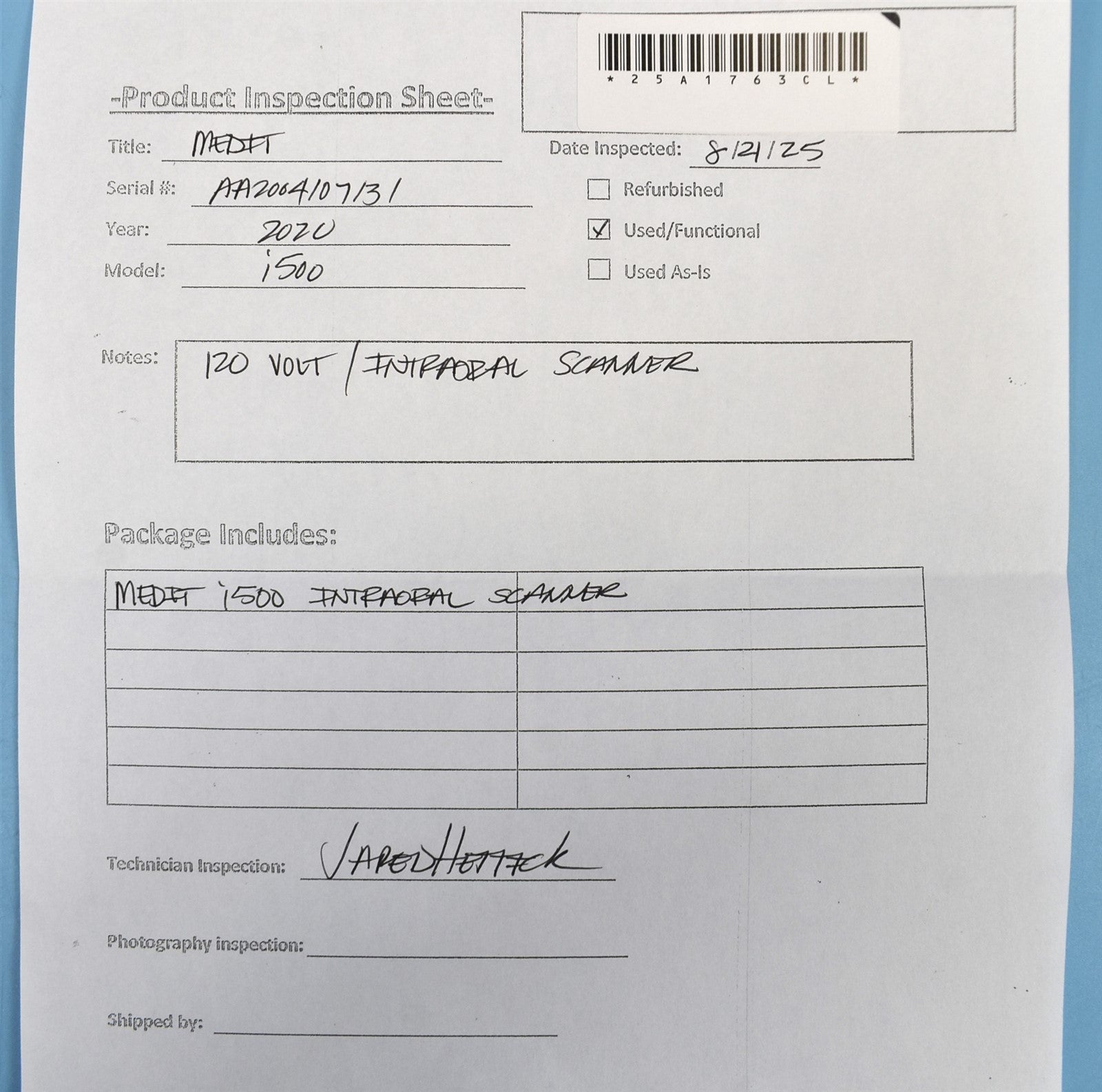 Atlas Resell Management has more experience testing and shipping CEREC and other CAD/CAM units than anyone else on eBay. Just check out the wide selection of CAD/CAM units in our store.We're proud to be the most trusted source for quality used CAD/CAM units in the pre-owned dental equipment market. Your purchase will NOT include:Power supplyThis product is pre-owned and may not include the same accessories as a new, unused unit. - other accessories not shown or listed here. Medit i500 Intraoral Scanner High-speed scanning at ~35 frames per second Accurate scanning: up to 21 µm ± 1.48 µm (high precision) Dual-camera system with LED imaging for HD full-color capture Triangulation technology for reliable 3D imaging with minimal moving parts Powderless operation for enhanced patient comfort Ergonomic, lightweight design (~280 g) with small tip for easy intraoral access Single-button control for intuitive scan start-stop functions Open architecture: exports STL, OBJ, and PLY formats; seamless Medit Link integration Removable & autoclavable tips—cross-infection control (up to ~50 cycles) No subscription fees; cost-effective entry-level solutionMedit i500 Intraoral Scanner was powered on (USB) , Blue light came on. Fan is running. Inspection Result: - Ready for Resale.