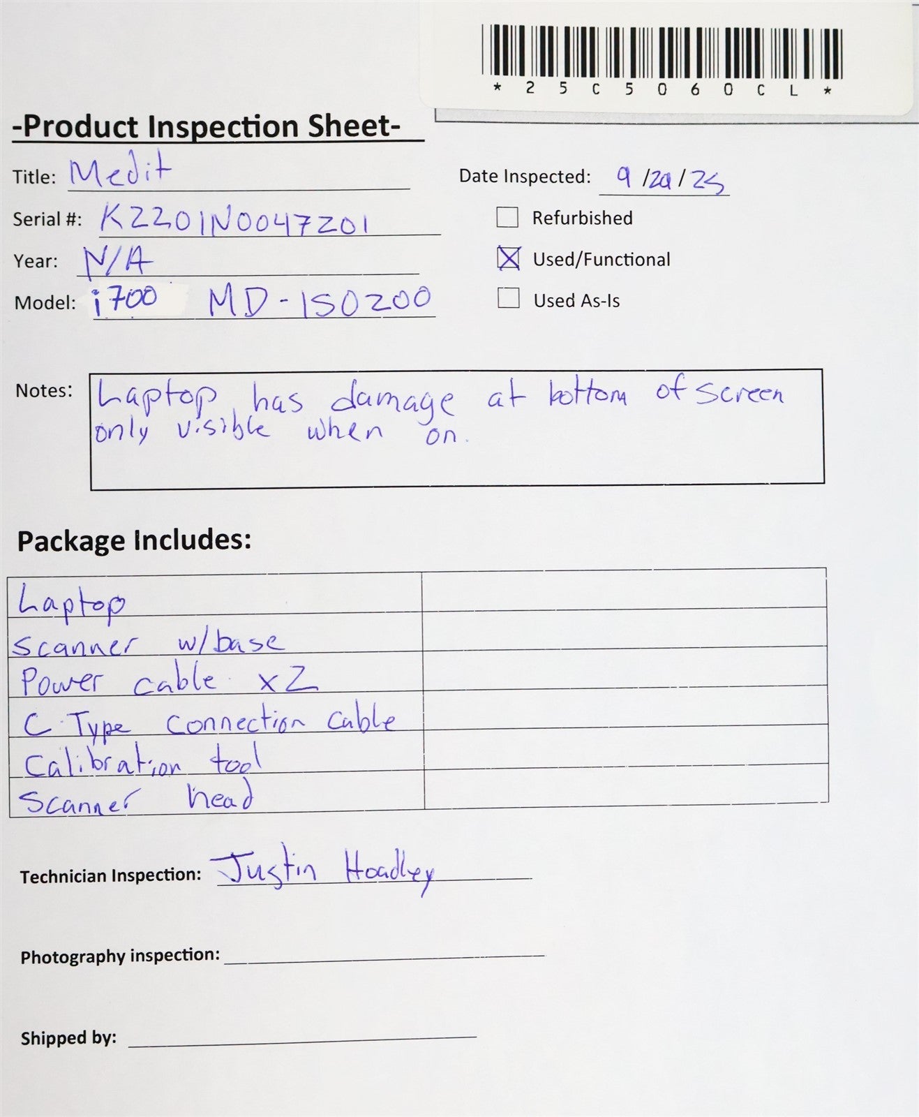 The laptop was powered on and successfully initialized. Software functionality was reviewed to ensure proper operation. The scanner was tested and calibrated, confirming that all components are functioning within expected parameters.